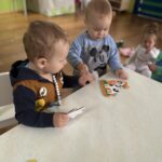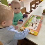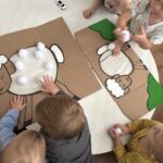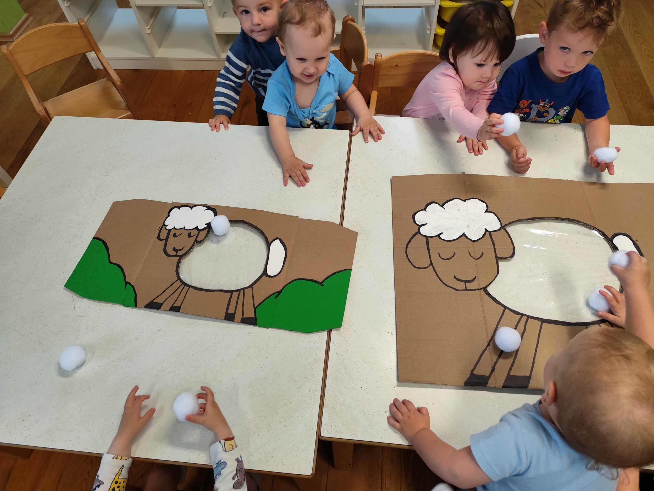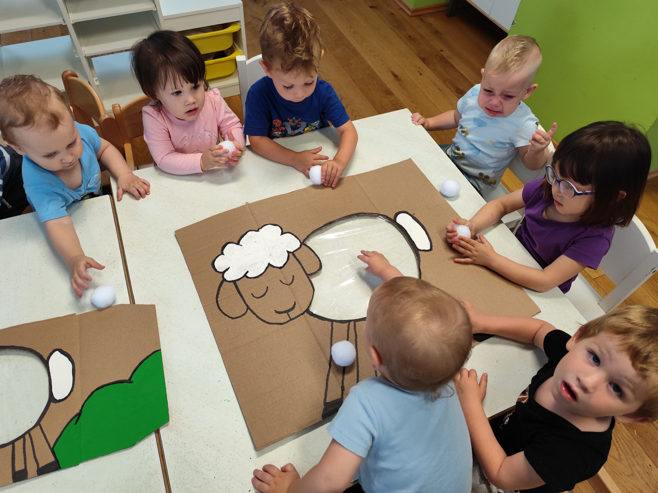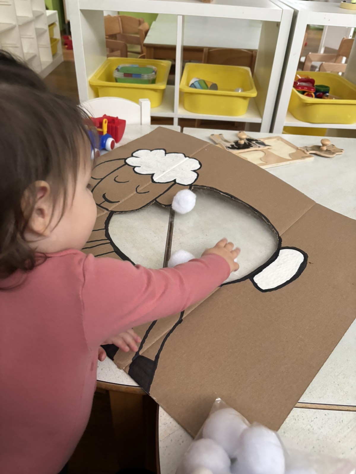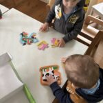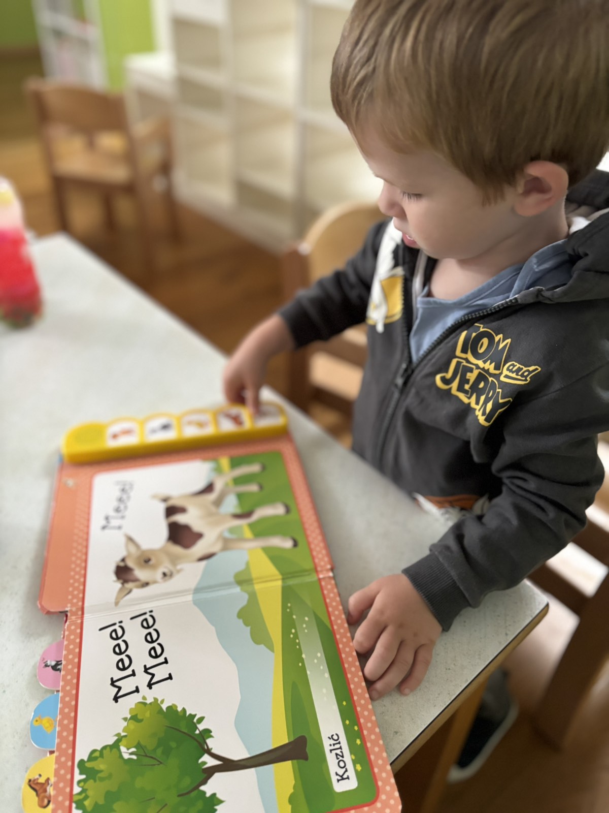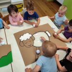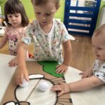 Početkom srpnja Balončići su istraživali vrste domaćih životinja. Kroz različite aktivnosti razvijali su vizualnu, slušnu i taktilnu percepciju. Proučavali su slikovnice i otkrivali u kakvim nastambama žive ovce, krave, konji, psi, patke… Otkrivali su koje sve životinje žive na farmi i kako izgledaju njihovi mladunci. Najviše interesa pokazali su za didaktičke slagalice i drvene umetaljke sa životinjskim motivima. Balončići su oponašali glasanje domaćih životinja i slušali pjesmice o njima. Uz pomoć mekanih materijala sastavljali su tijelo ovce na kartonu. Kroz likovnu aktivnost, temperama su otiskivali dlanove kako bi prikazali izgled krave.