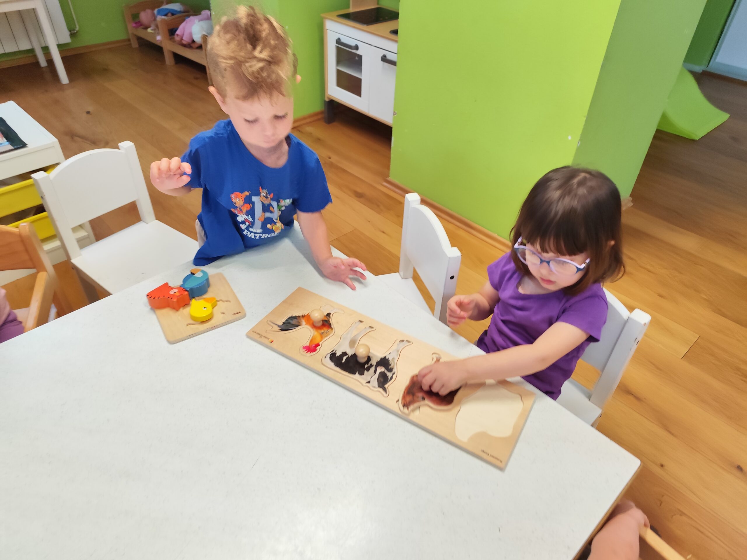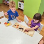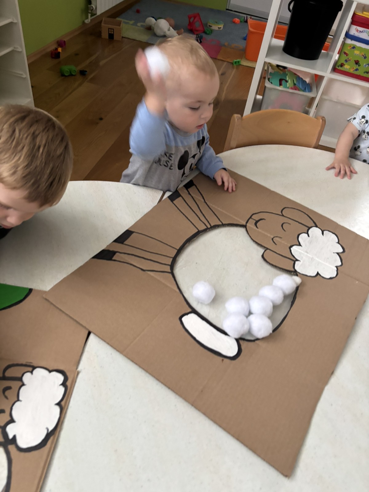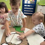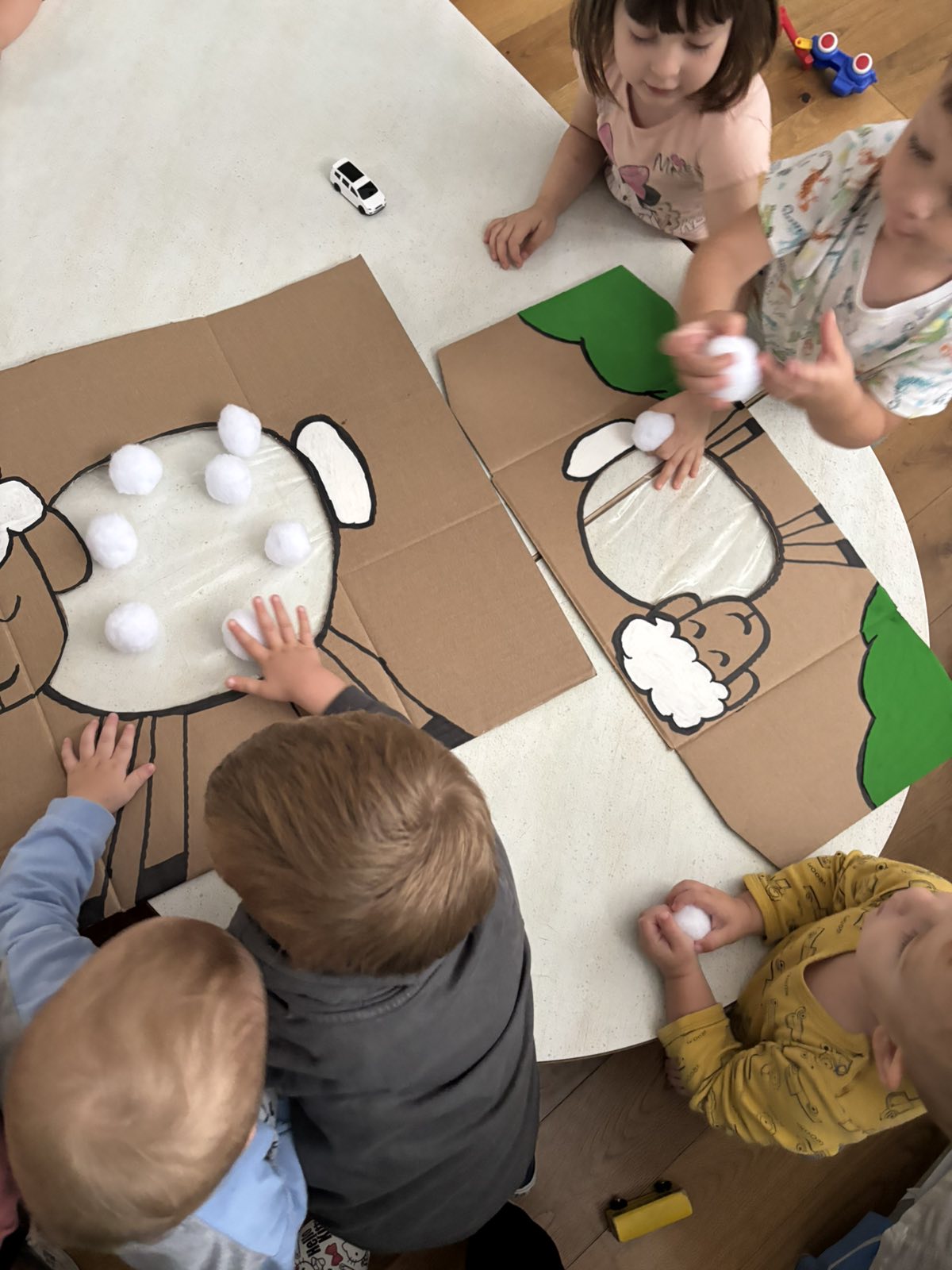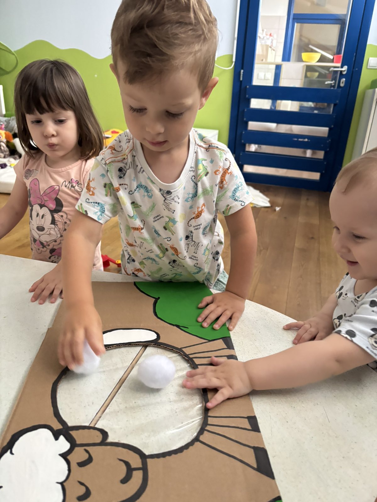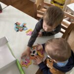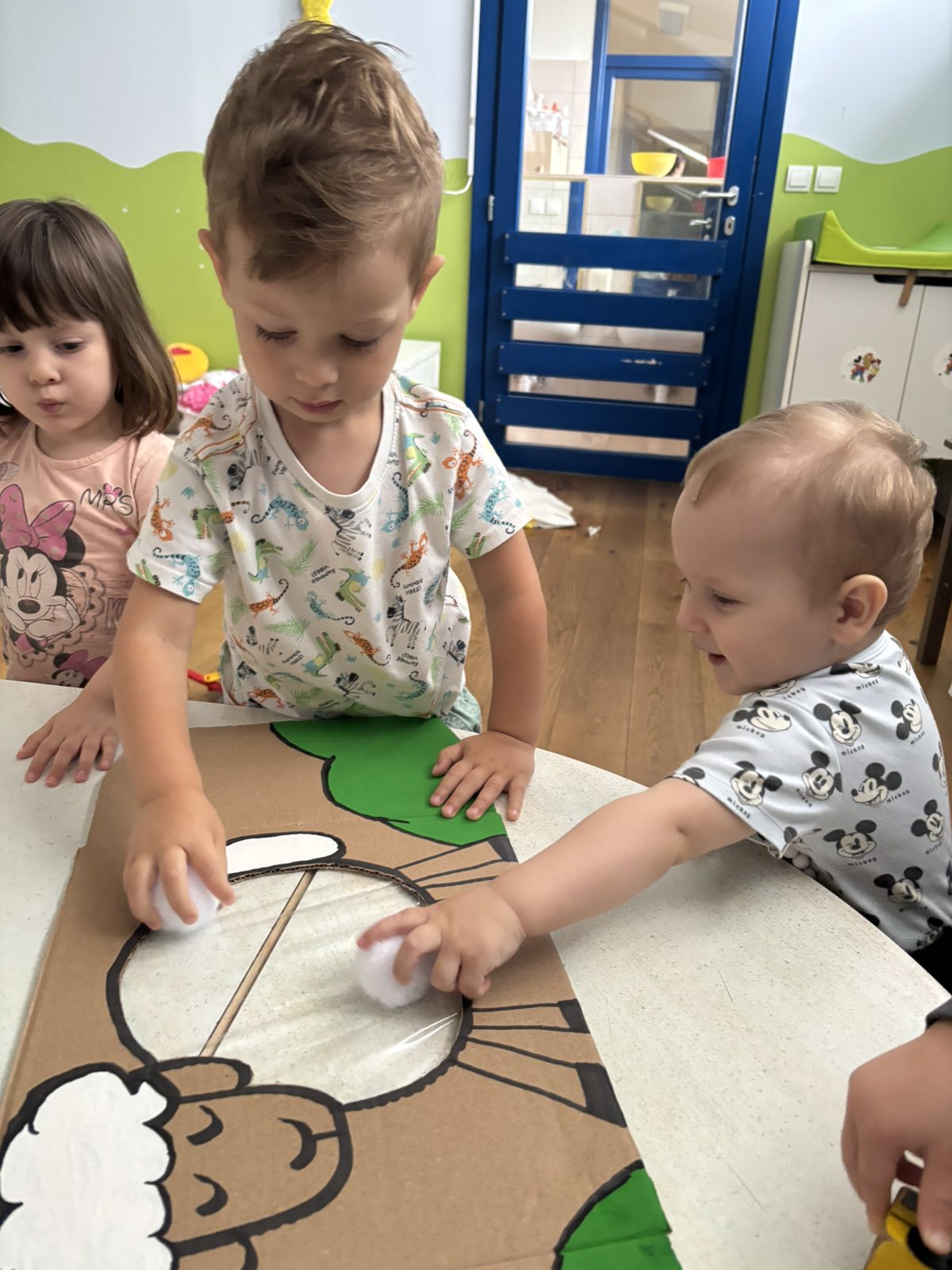 Početkom srpnja Balončići su istraživali vrste domaćih životinja. Kroz različite aktivnosti razvijali su vizualnu, slušnu i taktilnu percepciju. Proučavali su slikovnice i otkrivali u kakvim nastambama žive ovce, krave, konji, psi, patke… Otkrivali su koje sve životinje žive na farmi i kako izgledaju njihovi mladunci. Najviše interesa pokazali su za didaktičke slagalice i drvene umetaljke sa životinjskim motivima. Balončići su oponašali glasanje domaćih životinja i slušali pjesmice o njima. Uz pomoć mekanih materijala sastavljali su tijelo ovce na kartonu. Kroz likovnu aktivnost, temperama su otiskivali dlanove kako bi prikazali izgled krave.