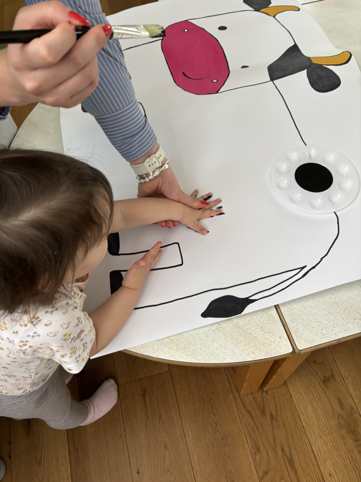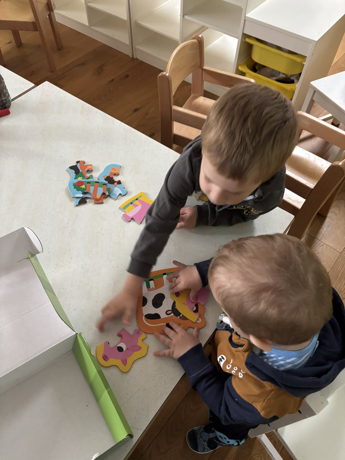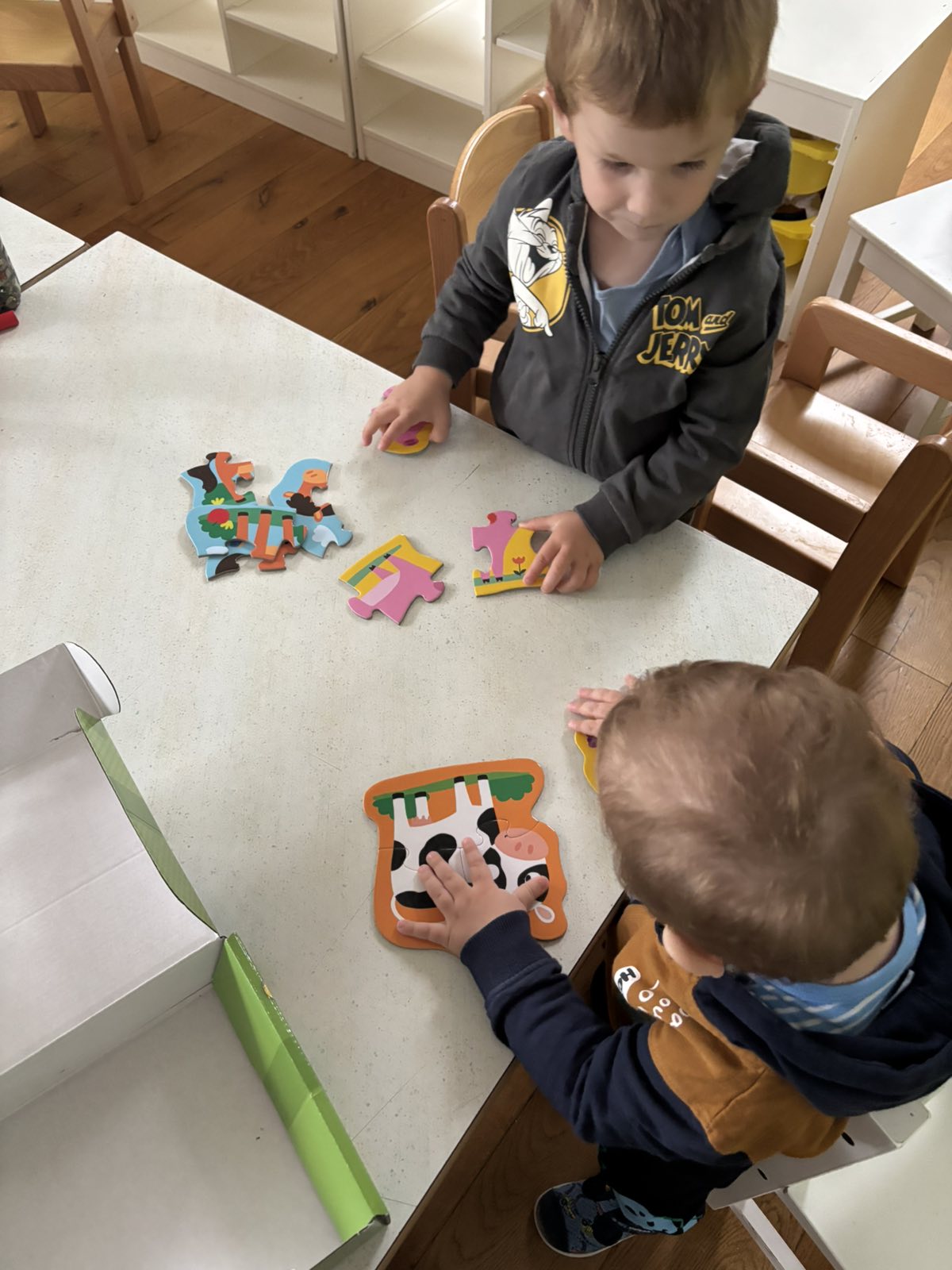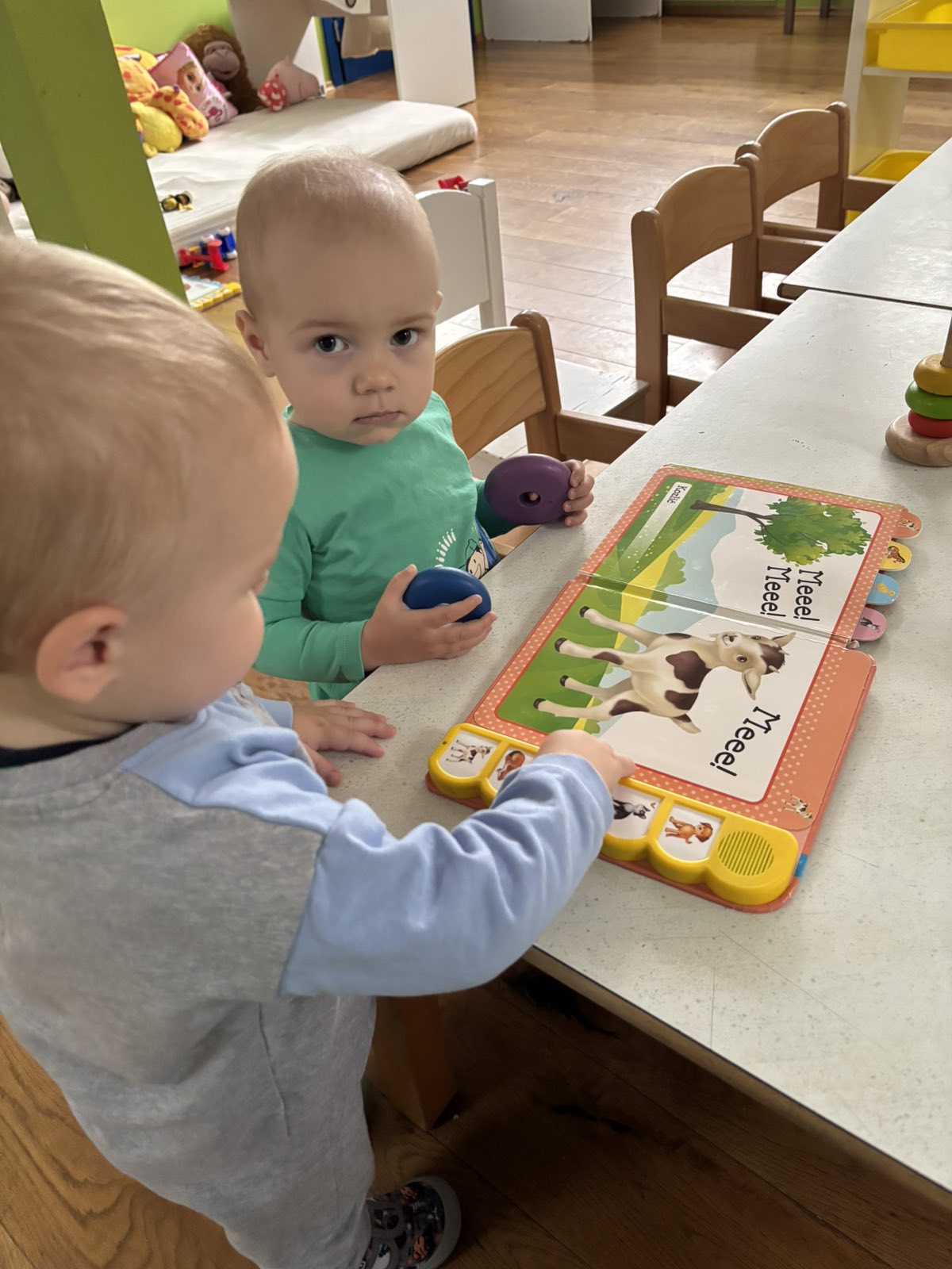 Početkom srpnja Balončići su istraživali vrste domaćih životinja. Kroz različite aktivnosti razvijali su vizualnu, slušnu i taktilnu percepciju. Proučavali su slikovnice i otkrivali u kakvim nastambama žive ovce, krave, konji, psi, patke… Otkrivali su koje sve životinje žive na farmi i kako izgledaju njihovi mladunci. Najviše interesa pokazali su za didaktičke slagalice i drvene umetaljke sa životinjskim motivima. Balončići su oponašali glasanje domaćih životinja i slušali pjesmice o njima. Uz pomoć mekanih materijala sastavljali su tijelo ovce na kartonu. Kroz likovnu aktivnost, temperama su otiskivali dlanove kako bi prikazali izgled krave.