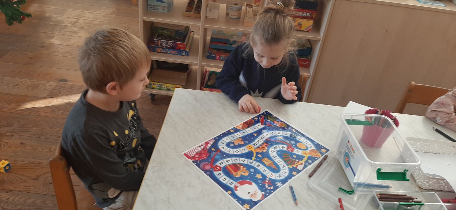 Od kolaža i hamera izrađivali smo najljepše čizmice i čestitke. Ukrasili smo božićno drvce lancem kojeg smo sami izradili, također od kolaža. Uočavanje i koncentraciju uvježbavali smo tražeći razlike na radnim listićima. Razvoj matematičkih vještina poticali smo raznim tematskim logičkim tablicama. Pomagali smo jedni drugima brojati na hrvatskom i engleskom. Promatrali smo promjene u prirodi, sagradili snjegovića i izradili anđele u snijegu.