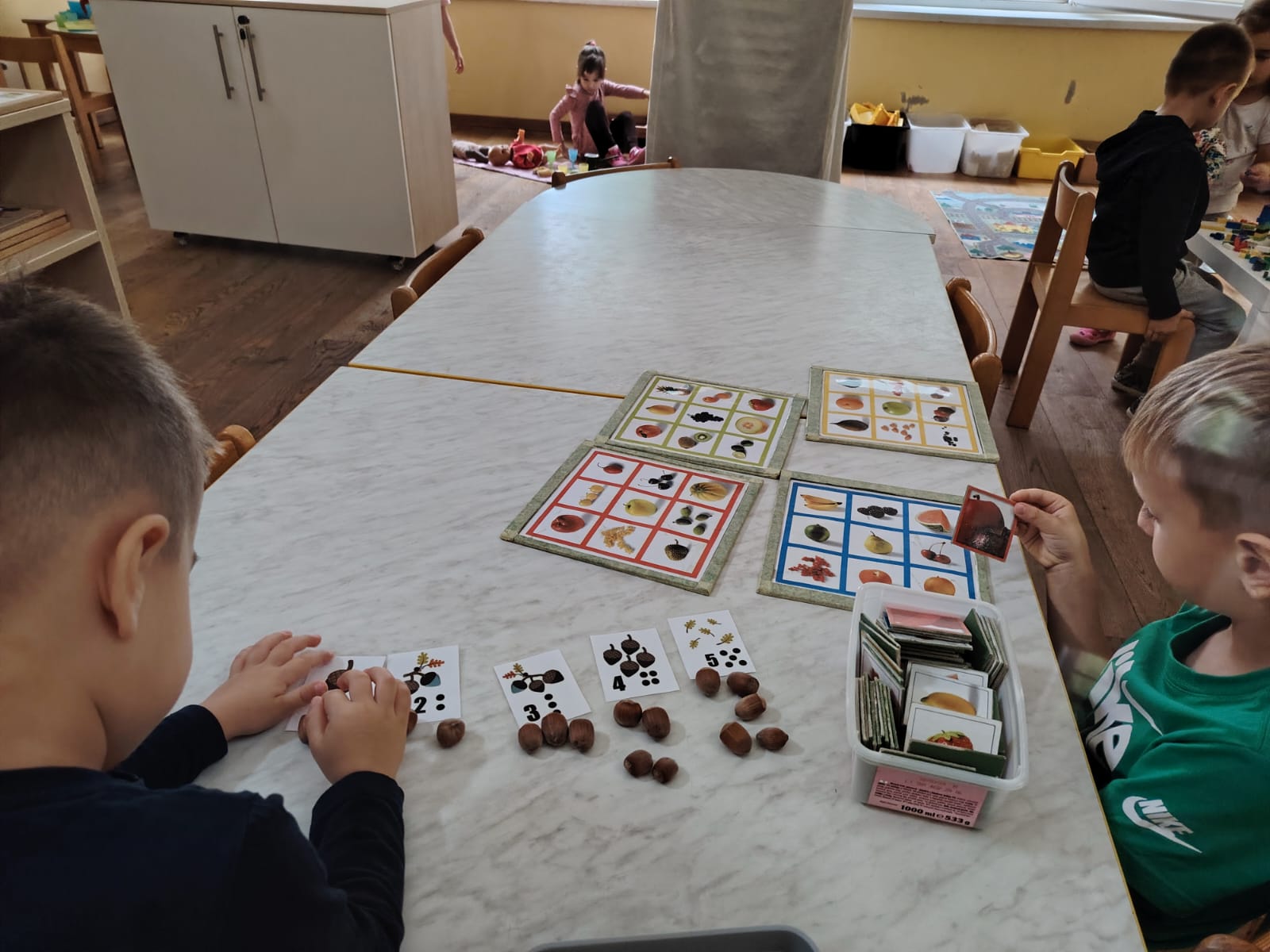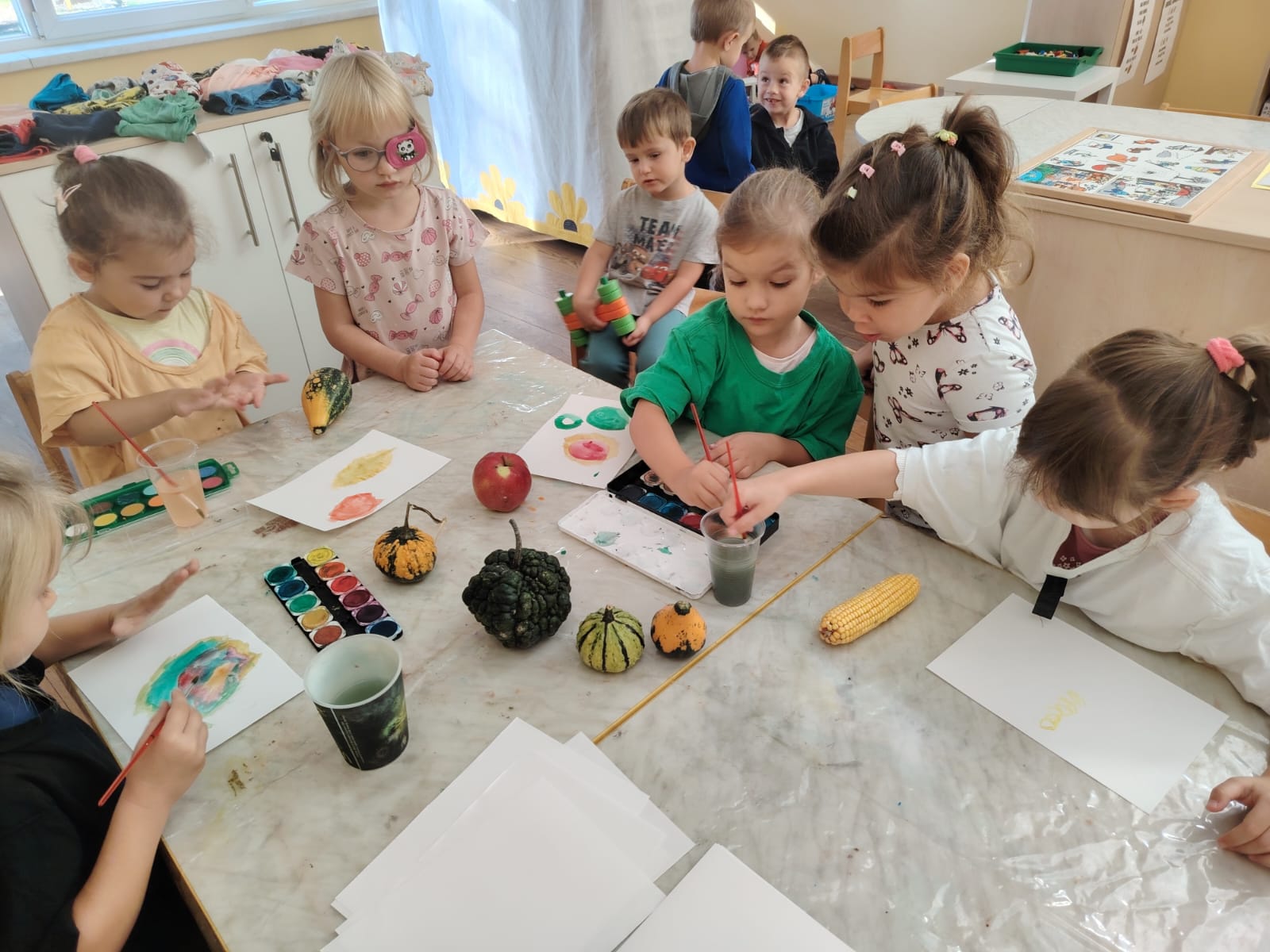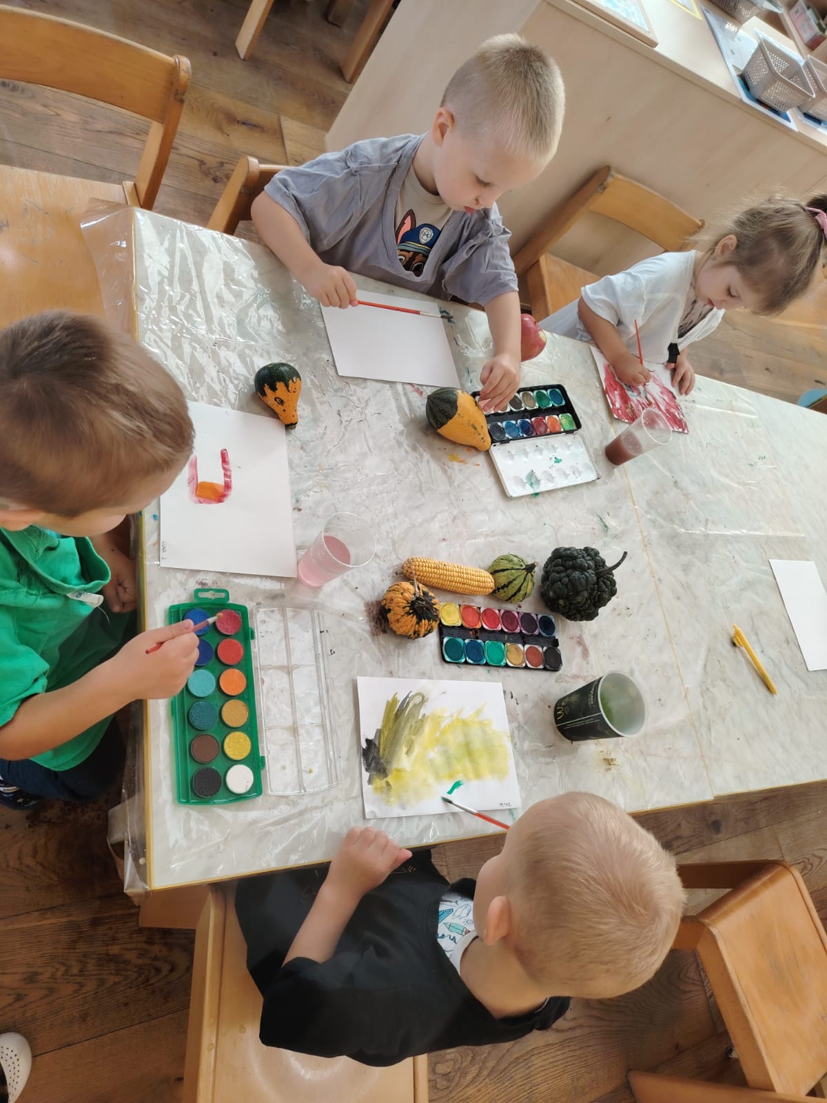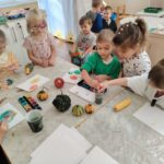 Vodene boje poslužile su nam za slikanje jesenskih plodova, pri čemu su djeca jačala finu motoriku, maštu i osjećaj za boju i oblik. U istraživačkom centru Mišići su proučavali fotografije jesenskih plodova i uspoređivali ih sa stvarnima, čime smo poticali pažnju, opažanje i spajanje riječi s pojmom.