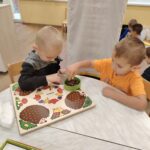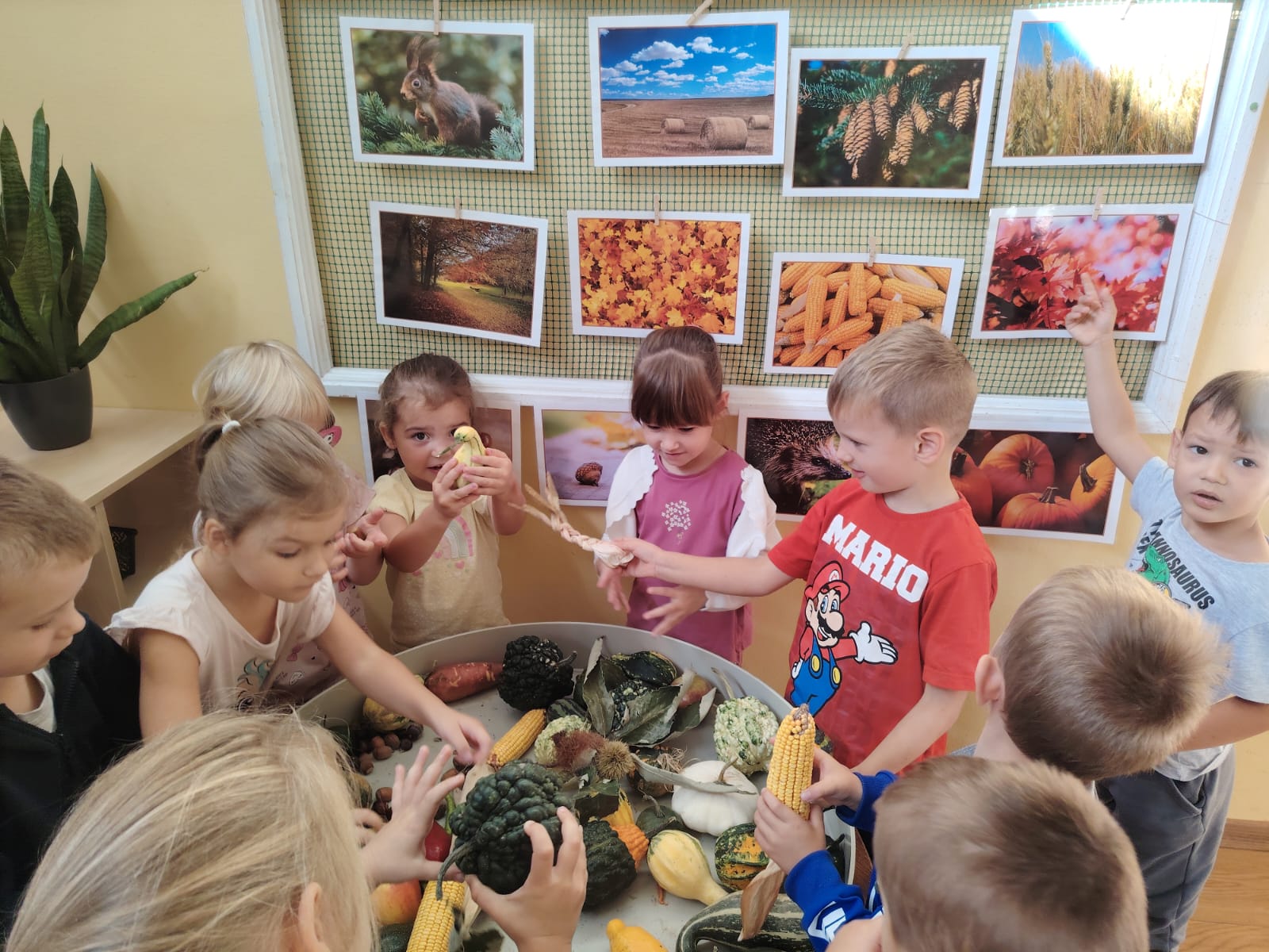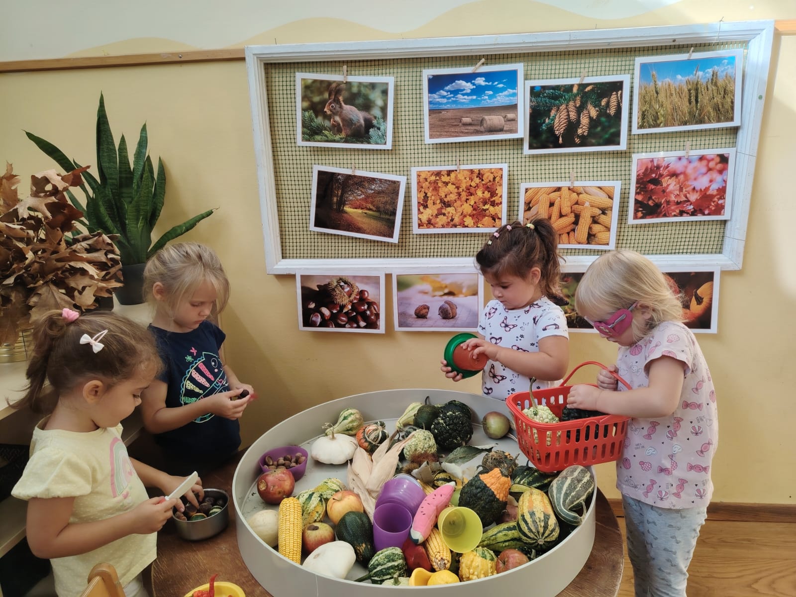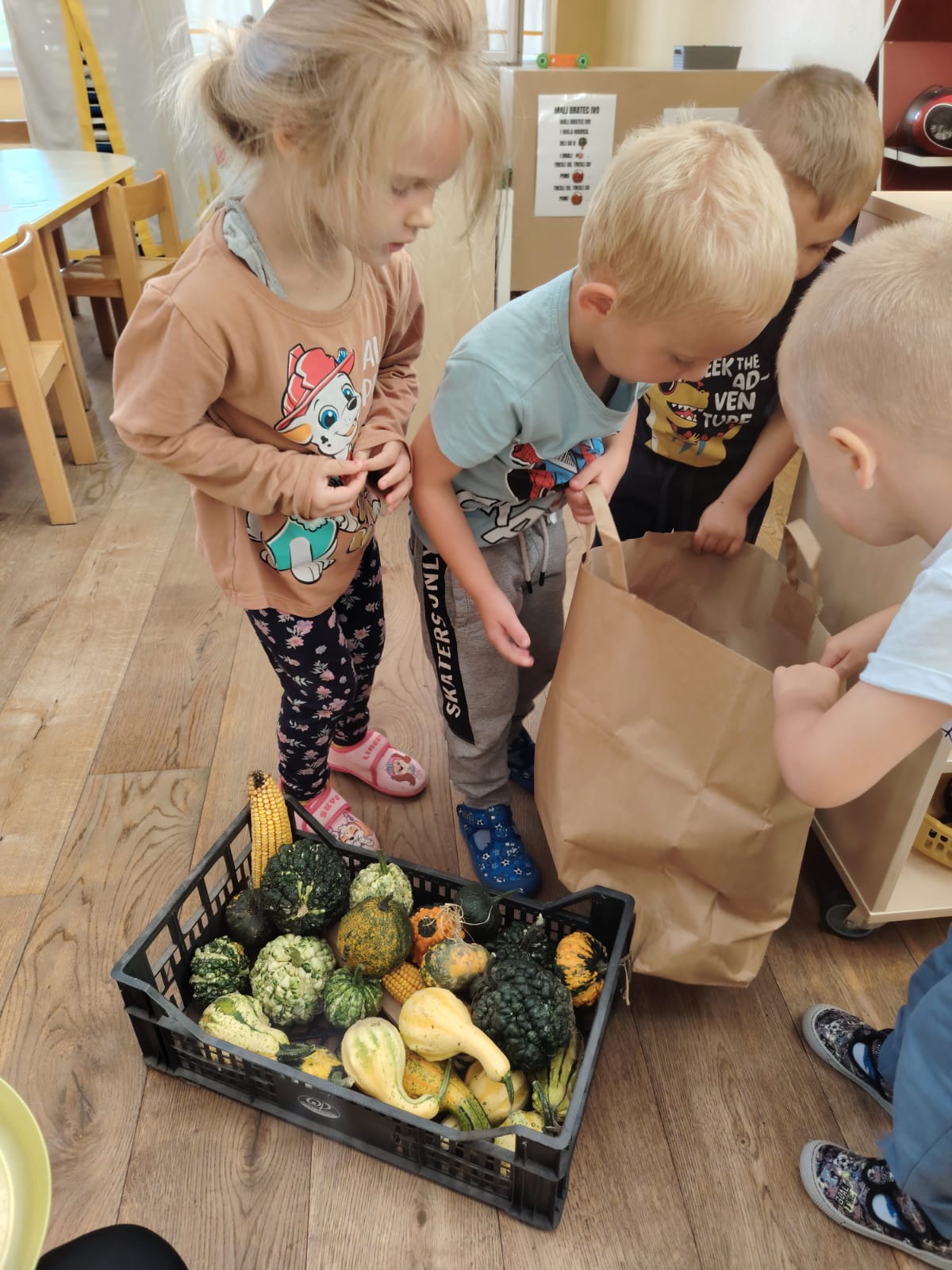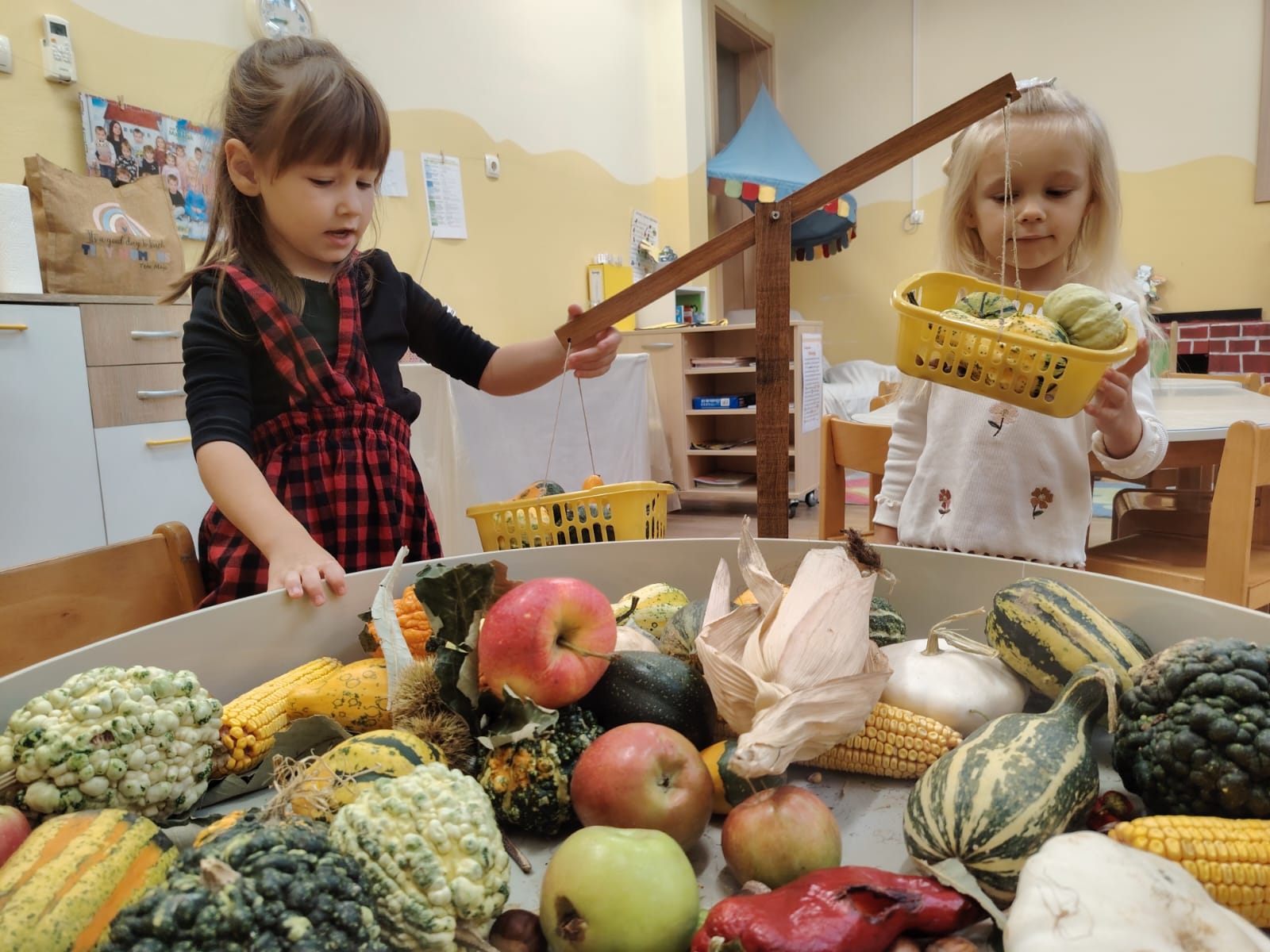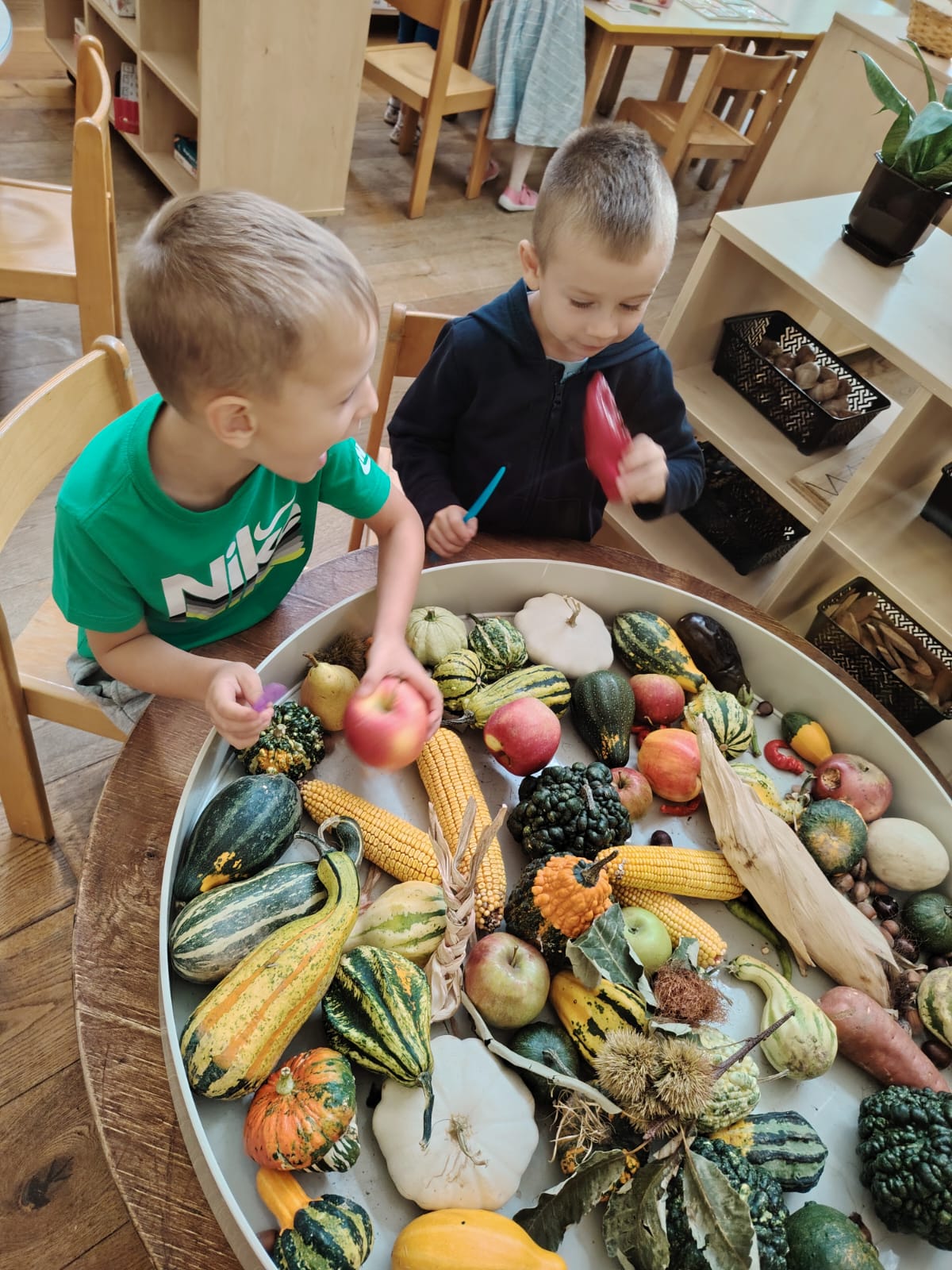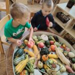 U skupini Mišići protekli smo tjedan obilježavali dolazak jeseni kroz igru, pjesmu i istraživanje. Djeca su svakodnevno donosila razne jesenske plodove koje smo zajedno promatrali, opipavali, uspoređivali i vagali. Tako smo razvijali senzorna iskustva, predmatematičke vještine i bogatili rječnik.
