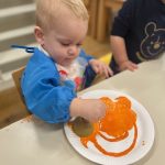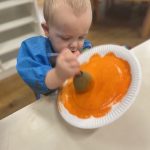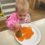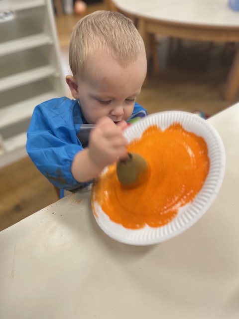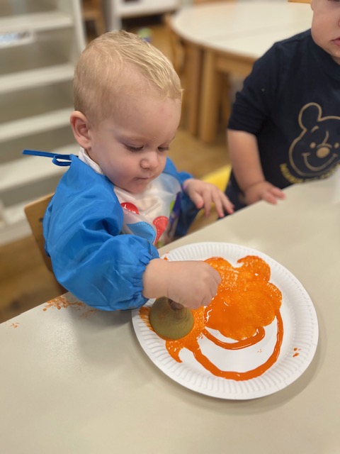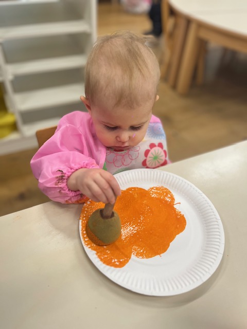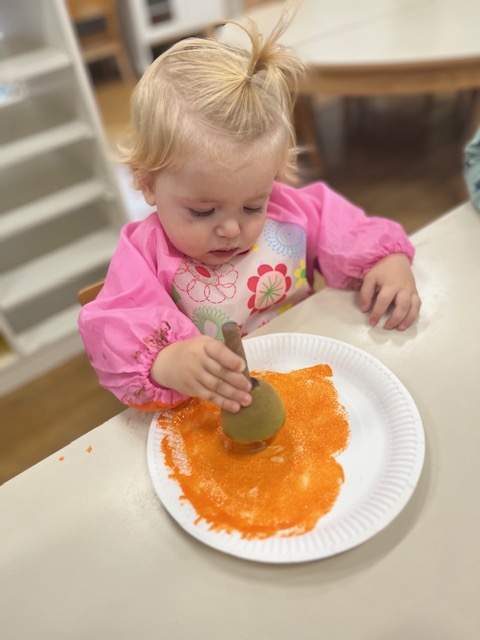 Jesen je stigla u naš vrtić, a s njom i omiljena kraljica jeseni – bundeva! Djeca su s velikim veseljem promatrala različite vrste bundeva koje smo donijeli u skupinu. Razgovarali smo o njihovim bojama, oblicima i veličinama, te smo naučili da bundeve mogu biti žute, narančaste, zelene pa čak i bijele. U likovnom centru djeca su bojala bundeve koristeći temperu i spužvice. Time su razvijali finu motoriku i kreativnost. U centru istraživanja djeca su promatrala unutrašnjost bundeve te mirisala bundevino meso, tako smo poticali spoznajni razvoj, istraživački duh i bogatili rječnik novim pojmovima. Zajedno smo pjevali pjesmice o jeseni i bundevama, „Bundeva pleše“, „Jesen stiže bundeva miriše“.. Aktivnost je poticala timski rad, koordinaciju pokreta i emocionalni razvoj kroz suradnju i zajedničko stvaranje. Djeca su uživala, a naš vrtić sada krasi prava jesenska čarolija – veseli svijet bundeva!