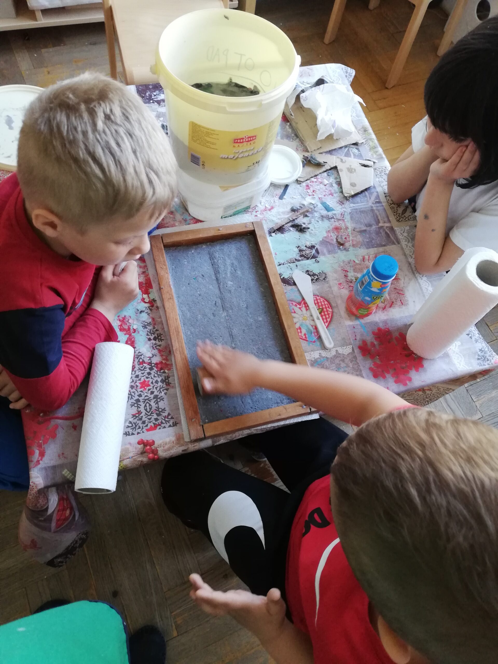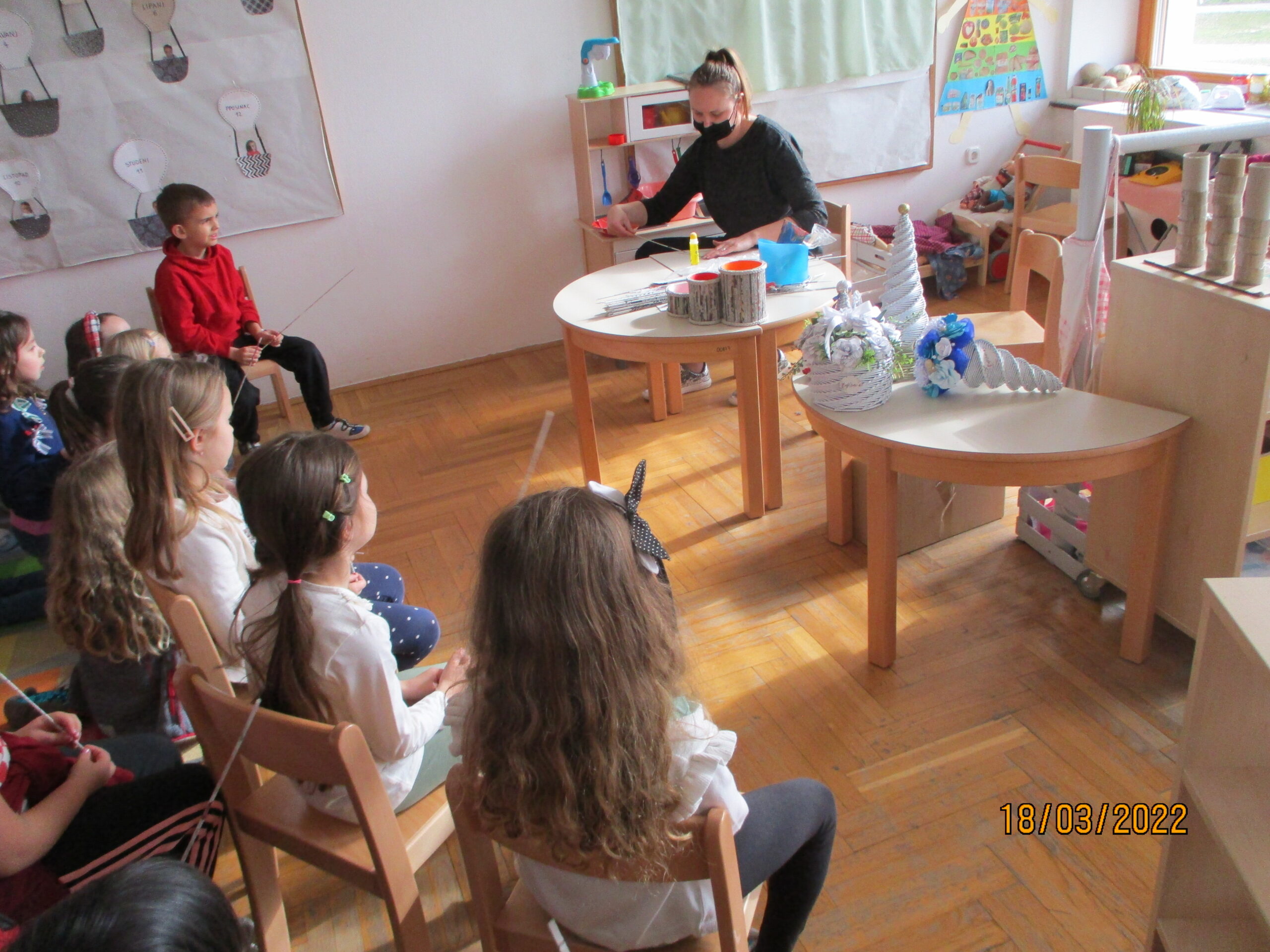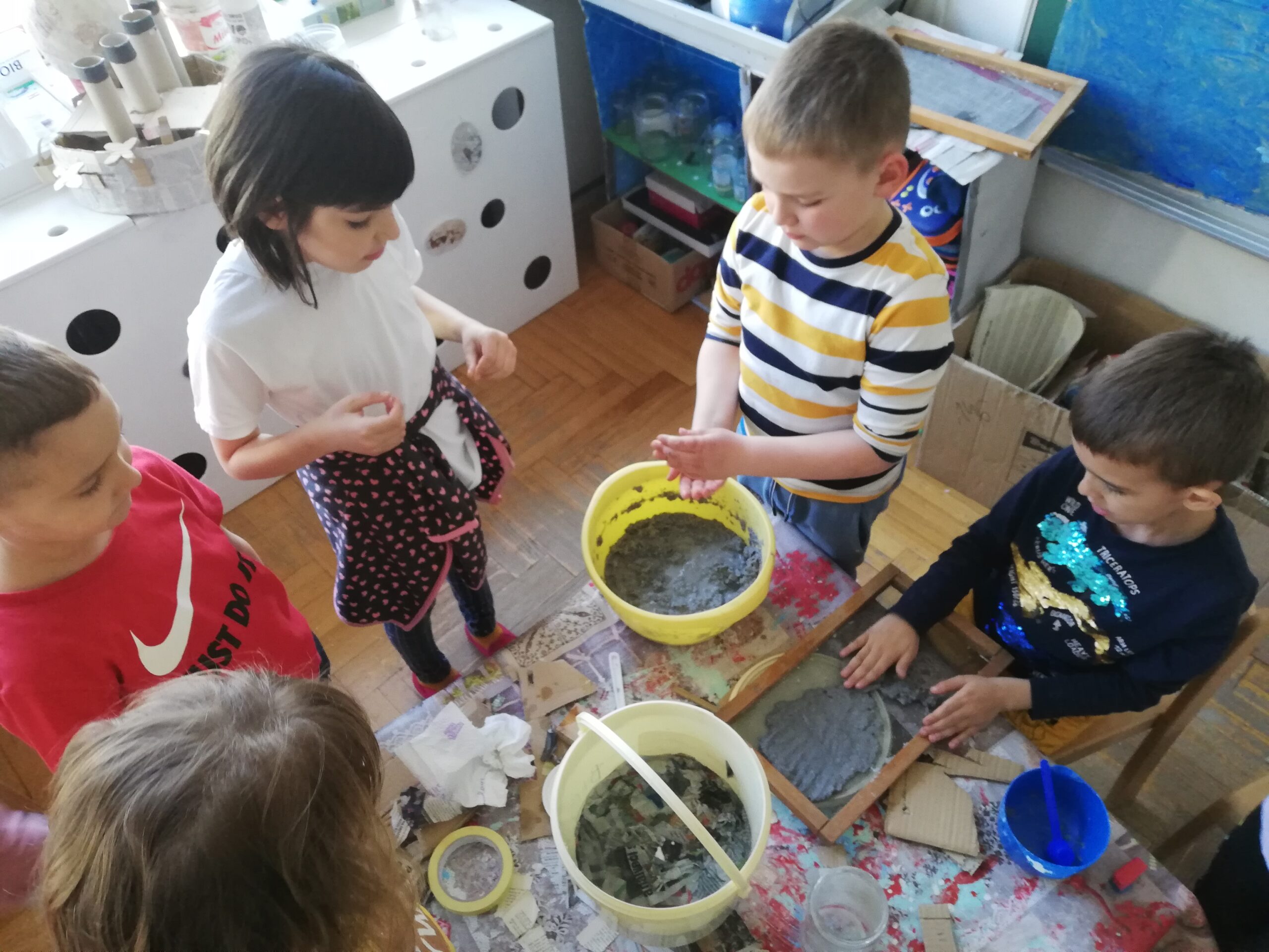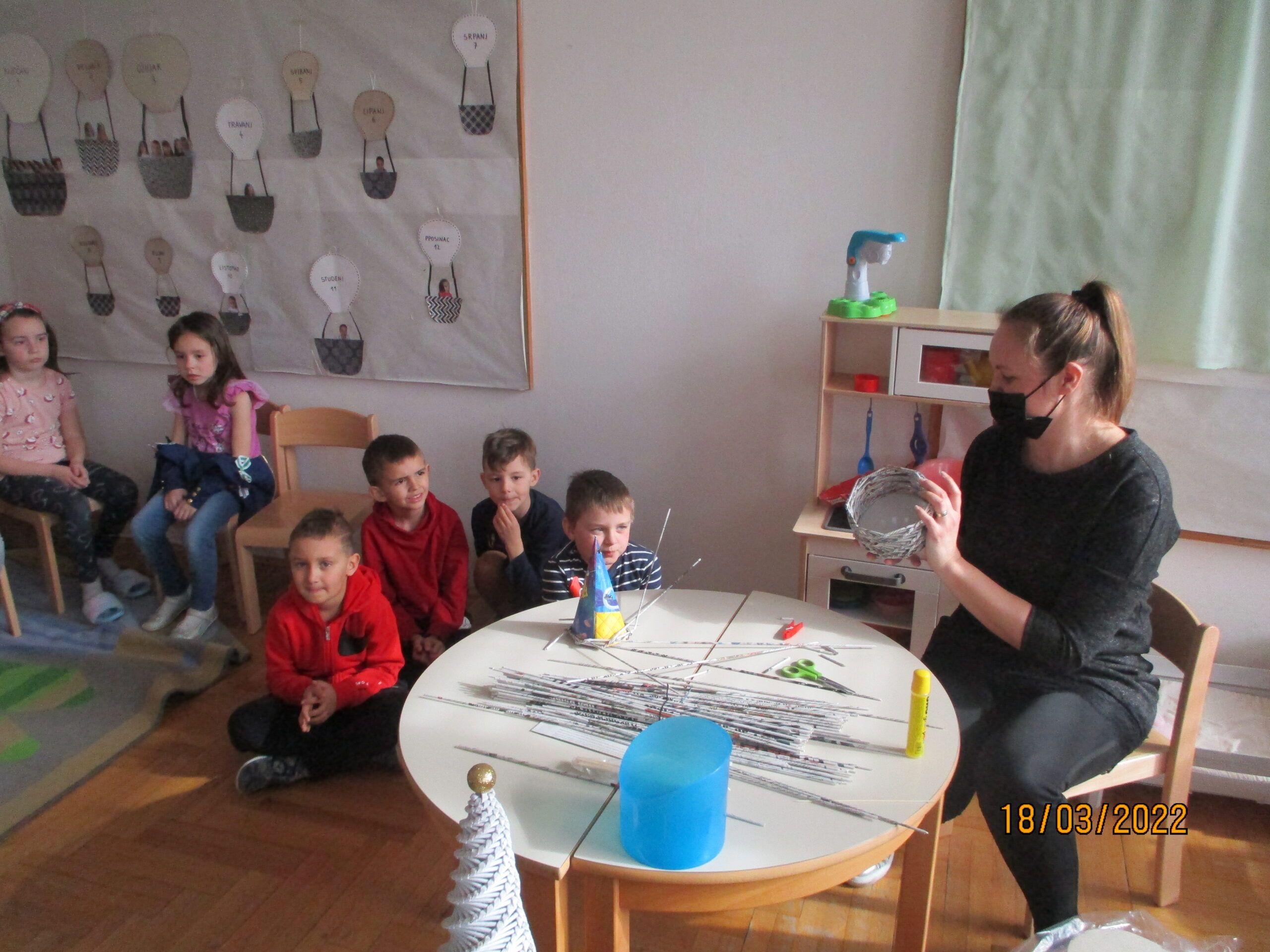 Prvi korak u korištenju starog papira za ponovnu upotrebu jest njegovo prikupljanje, a zatim sortiranje. Papir se prikuplja tako da se odlaže u za to predviđene spremnike – plave kontejnere. Reciklirani papir upotrebljava se u proizvodnji knjiga, časopisa, novina, vrećica i drugih proizvoda. Pogledali smo kako izgleda vrećica napravljena od recikliranog papira i pronašli smo na njoj znak za recikliranje. U goste smo pozvali gospođu Jelenu Ovnić koja od odbačenih starih novina izrađuje prekrasne ukrase i uporabne predmete. Djeca su izražavala oduševljenje kada su vidjela što se može napraviti od starog papira. Posebice su im bili zanimljivi papirnati štapići za pletenje pa su ih pokušali napraviti uz pomoć Jelene i svojih odgojiteljica. Na poklon smo dobili uskrsnog zeca i kutije za odlaganje bojica. Ovo druženje i posjeta izložbi Otpadoidi potaknulo je djecu na ponovno korištenje starog papira kojeg sakupljaju i donose u vrtić sa svojim roditeljima. Svakodnevno stvaramo razna umjetnička djela koristeći stari papir. Stari papir možete upotrijebiti kod kuće kada vam ponestane ideja za igru sa svojim djecom. Napravite zajedno kreativne kantice od kartonske ambalaže za reciklažu papira, stakla i plastike. Izrezujte iz časopisa i letaka fotografije. Fotografije zalijepite za tvrđi karton (poleđine kalendara i sl.) i koristite ih za igru razvrstavanja. Možete i sakupljati bodove. Svatko uzme jednu kanticu, a fotografije stavite u platnenu vrećicu. Bod dobije natjecatelj koji je prvi sakupio sve fotografije s otpadom u svoju kanticu ( njih četiri, pet…ovisno koliko ih izradite). Ovom igrom kod djece ćete razviti odgovornost prema čuvanju okoline.