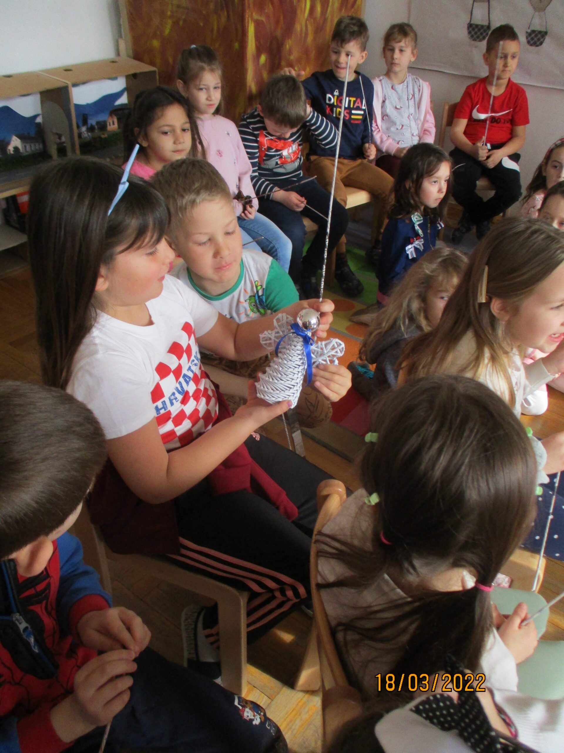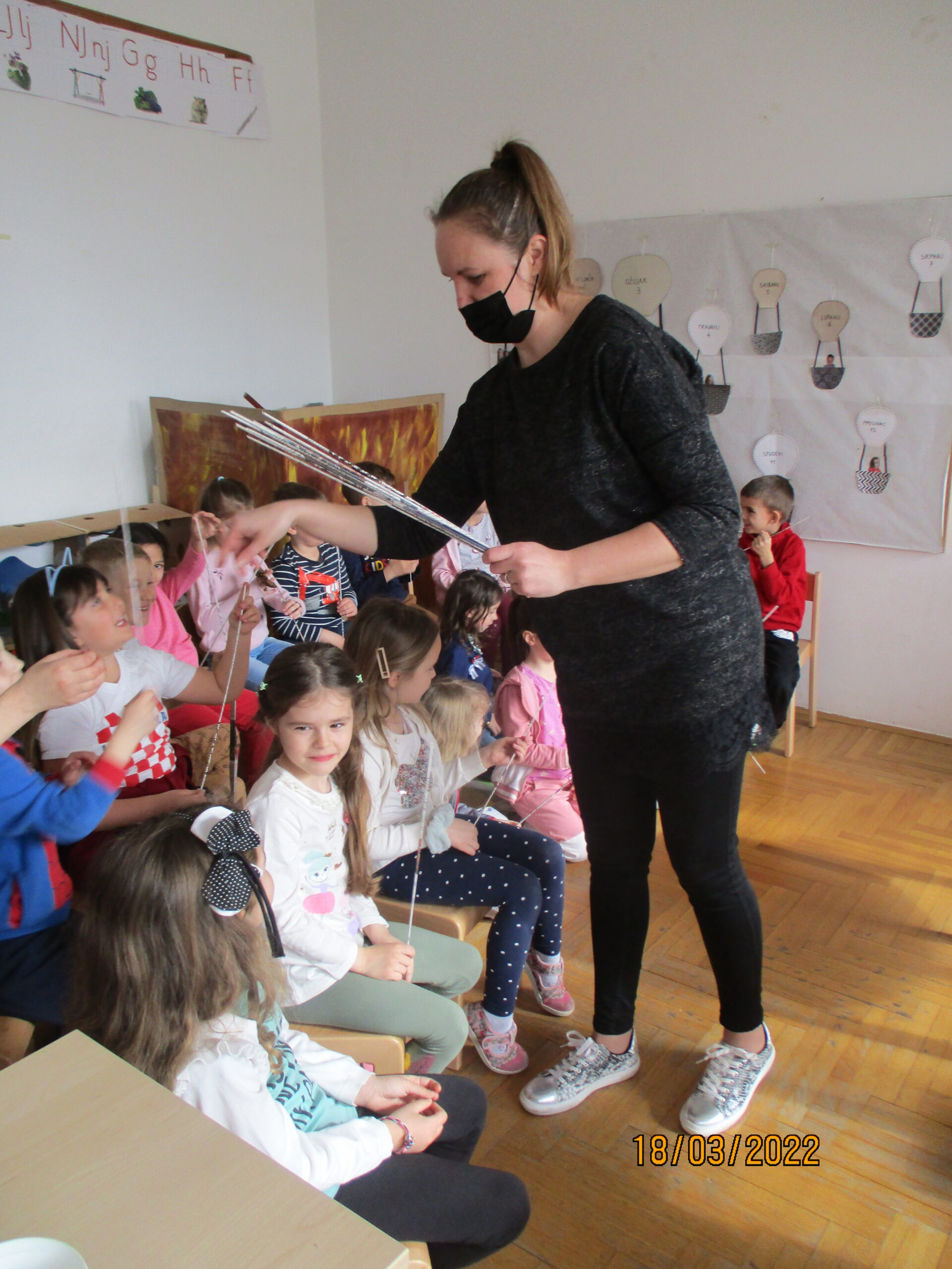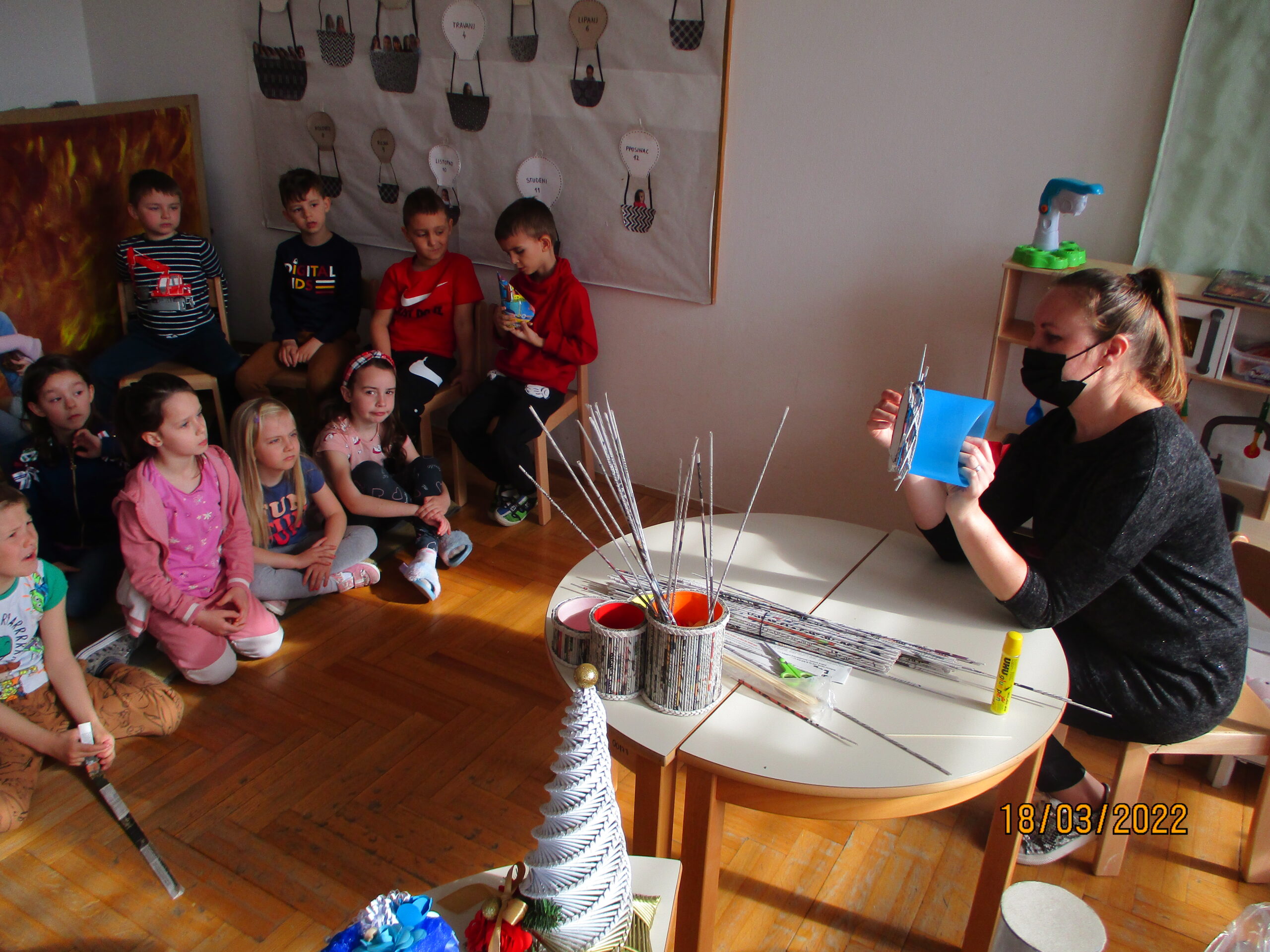Prvi korak u korištenju starog papira za ponovnu upotrebu jest njegovo prikupljanje, a zatim sortiranje. Papir se prikuplja tako da se odlaže u za to predviđene spremnike – plave kontejnere. Reciklirani papir upotrebljava se u proizvodnji knjiga, časopisa, novina, vrećica i drugih proizvoda. Pogledali smo kako izgleda vrećica napravljena od recikliranog papira i pronašli smo na njoj znak za recikliranje. U goste smo pozvali gospođu Jelenu Ovnić koja od odbačenih starih novina izrađuje prekrasne ukrase i uporabne predmete. Djeca su izražavala oduševljenje kada su vidjela što se može napraviti od starog papira. Posebice su im bili zanimljivi papirnati štapići za pletenje pa su ih pokušali napraviti uz pomoć Jelene i svojih odgojiteljica. Na poklon smo dobili uskrsnog zeca i kutije za odlaganje bojica. Ovo druženje i posjeta izložbi Otpadoidi potaknulo je djecu na ponovno korištenje starog papira kojeg sakupljaju i donose u vrtić sa svojim roditeljima. Svakodnevno stvaramo razna umjetnička djela koristeći stari papir. Stari papir možete upotrijebiti kod kuće kada vam ponestane ideja za igru sa svojim djecom. Napravite zajedno kreativne kantice od kartonske ambalaže za reciklažu papira, stakla i plastike. Izrezujte iz časopisa i letaka fotografije. Fotografije zalijepite za tvrđi karton (poleđine kalendara i sl.) i koristite ih za igru razvrstavanja. Možete i sakupljati bodove. Svatko uzme jednu kanticu, a fotografije stavite u platnenu vrećicu. Bod dobije natjecatelj koji je prvi sakupio sve fotografije s otpadom u svoju kanticu ( njih četiri, pet…ovisno koliko ih izradite). Ovom igrom kod djece ćete razviti odgovornost prema čuvanju okoline.