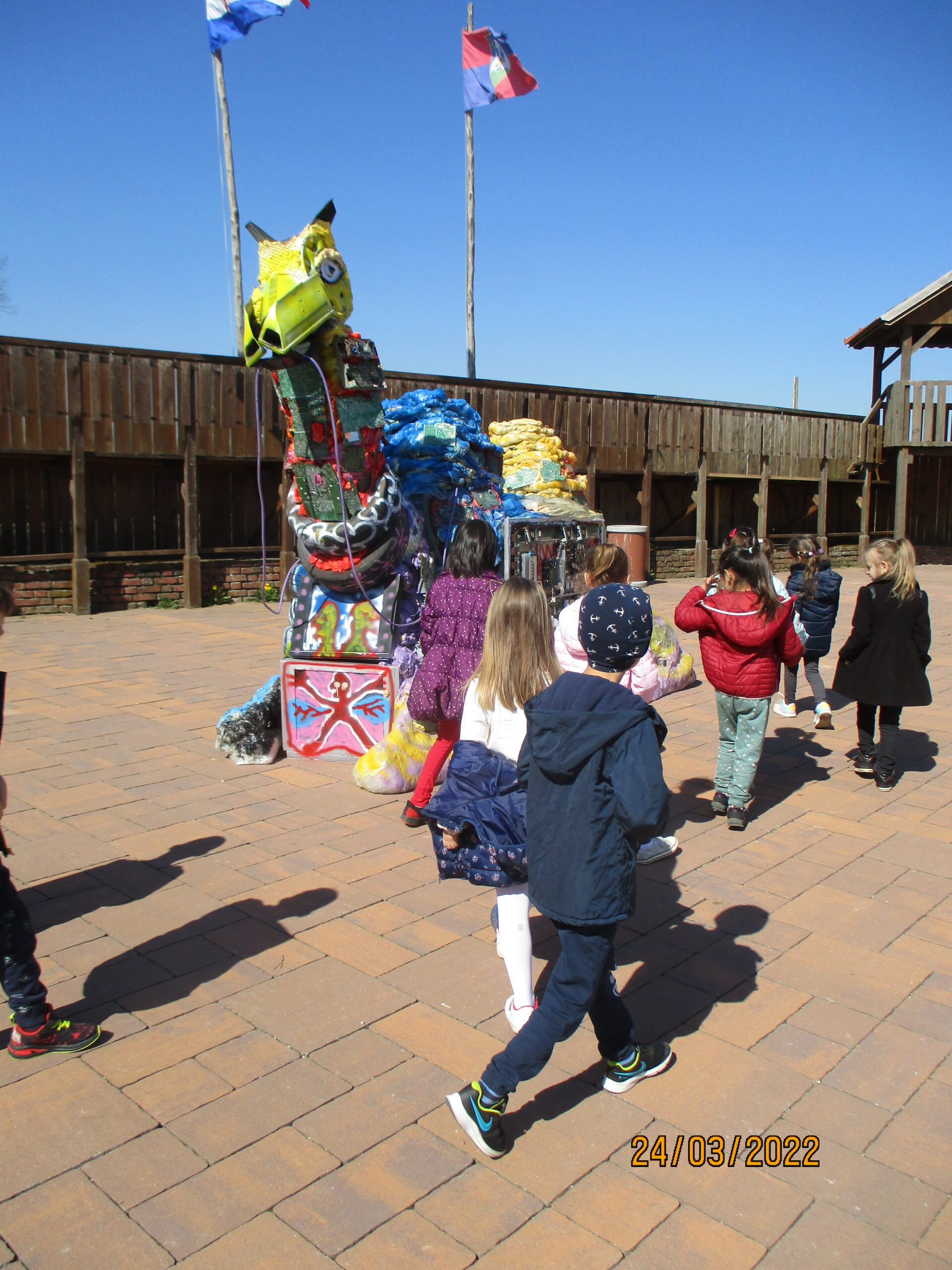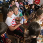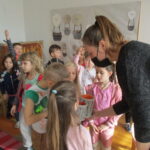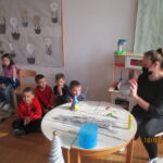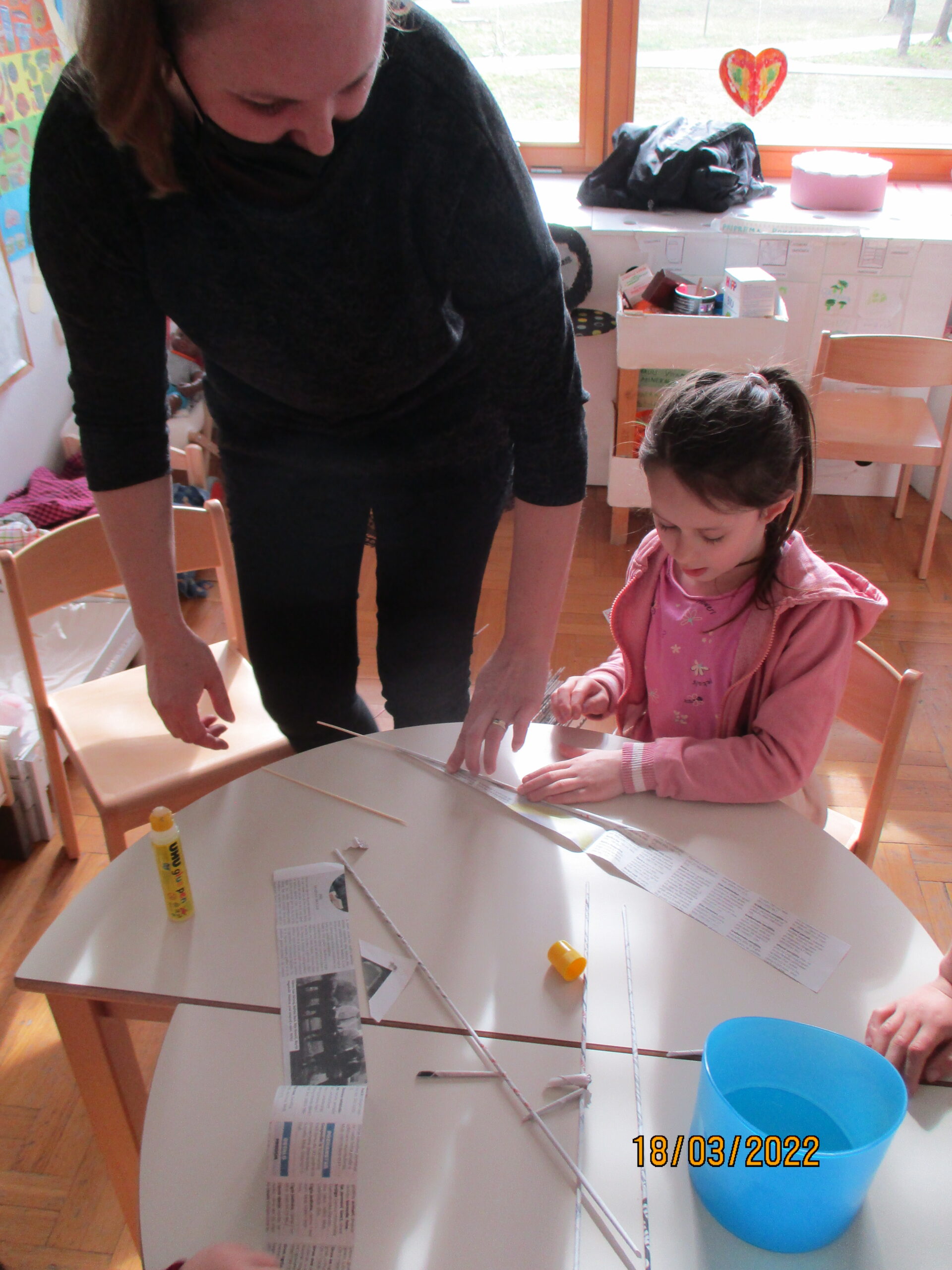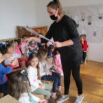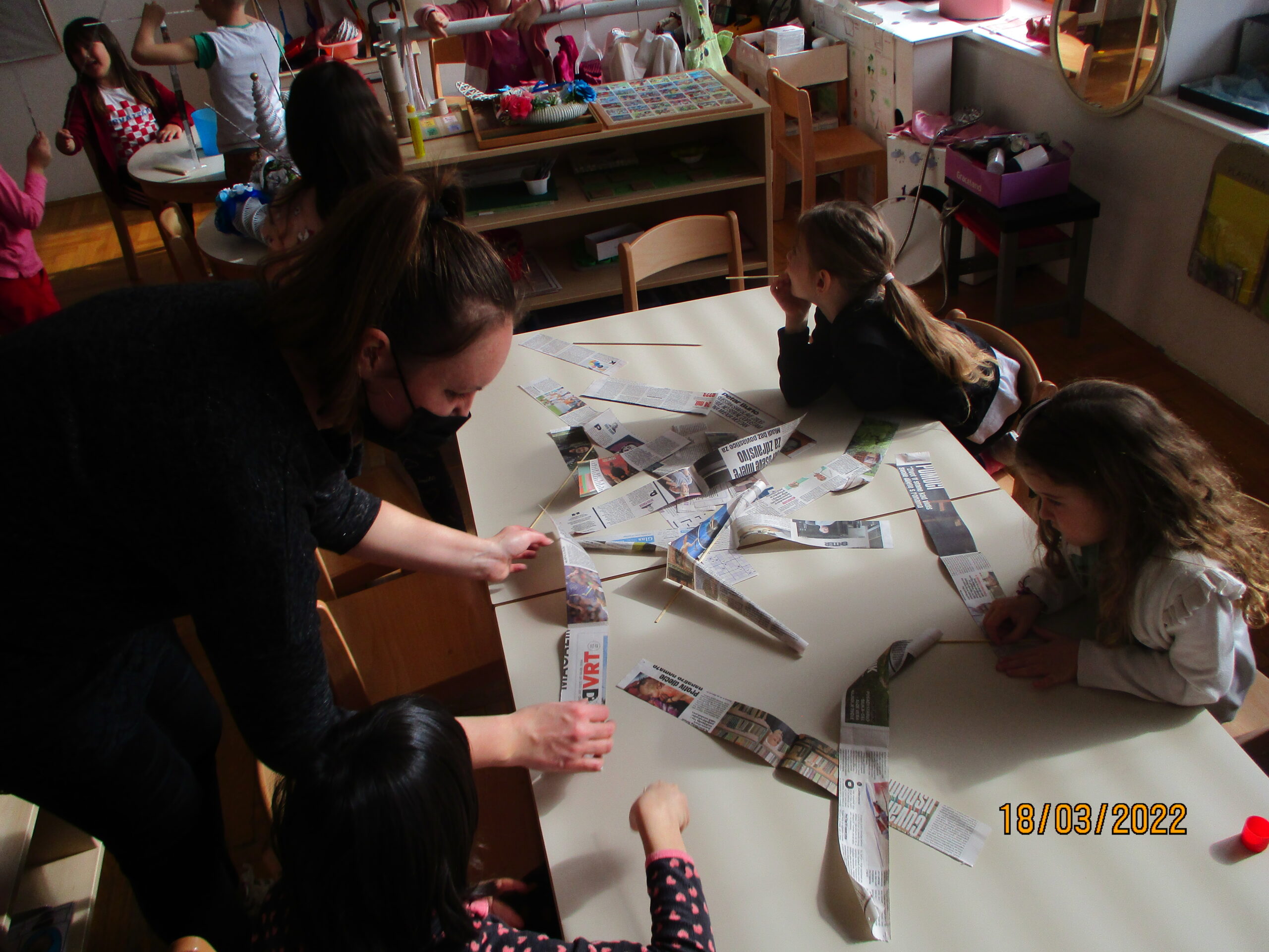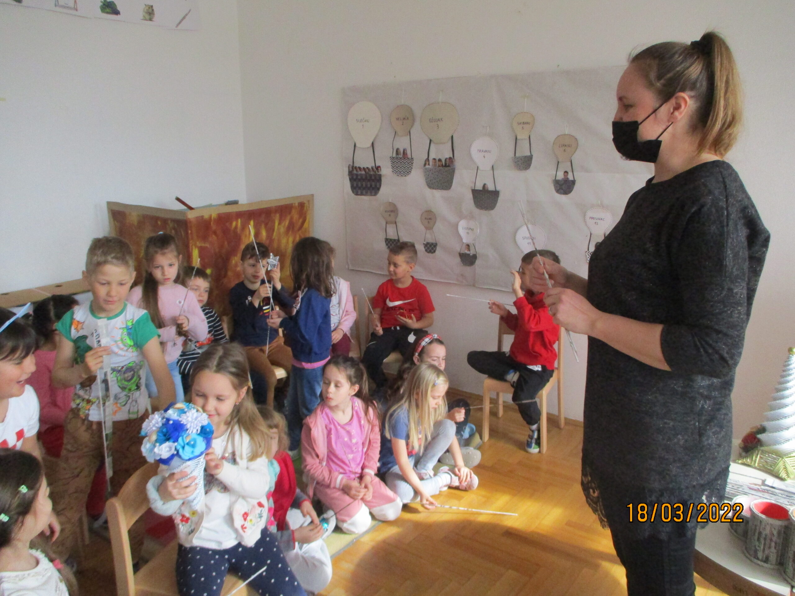 Prvi korak u korištenju starog papira za ponovnu upotrebu jest njegovo prikupljanje, a zatim sortiranje. Papir se prikuplja tako da se odlaže u za to predviđene spremnike – plave kontejnere. Reciklirani papir upotrebljava se u proizvodnji knjiga, časopisa, novina, vrećica i drugih proizvoda. Pogledali smo kako izgleda vrećica napravljena od recikliranog papira i pronašli smo na njoj znak za recikliranje. U goste smo pozvali gospođu Jelenu Ovnić koja od odbačenih starih novina izrađuje prekrasne ukrase i uporabne predmete. Djeca su izražavala oduševljenje kada su vidjela što se može napraviti od starog papira. Posebice su im bili zanimljivi papirnati štapići za pletenje pa su ih pokušali napraviti uz pomoć Jelene i svojih odgojiteljica. Na poklon smo dobili uskrsnog zeca i kutije za odlaganje bojica. Ovo druženje i posjeta izložbi Otpadoidi potaknulo je djecu na ponovno korištenje starog papira kojeg sakupljaju i donose u vrtić sa svojim roditeljima. Svakodnevno stvaramo razna umjetnička djela koristeći stari papir. Stari papir možete upotrijebiti kod kuće kada vam ponestane ideja za igru sa svojim djecom. Napravite zajedno kreativne kantice od kartonske ambalaže za reciklažu papira, stakla i plastike. Izrezujte iz časopisa i letaka fotografije. Fotografije zalijepite za tvrđi karton (poleđine kalendara i sl.) i koristite ih za igru razvrstavanja. Možete i sakupljati bodove. Svatko uzme jednu kanticu, a fotografije stavite u platnenu vrećicu. Bod dobije natjecatelj koji je prvi sakupio sve fotografije s otpadom u svoju kanticu ( njih četiri, pet…ovisno koliko ih izradite). Ovom igrom kod djece ćete razviti odgovornost prema čuvanju okoline.