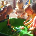 Tjedan u Srčekima je započeo pričom o Maloj sireni čiji su nas doživljaji toliko očarali da smo i sami crtali šaroliko morsko dno. Upoznavali smo životinjice poput morskog konjica, raže ili čak morske zvijezde te ih nalazili i imenovali i u drugim slikovnicama. Sami smo napunili kadicu s vodom te započeli veselu igru prskanja i manipuliranja spužvicama, školjkama i već spomenutim životinjama. Razvrstavali smo ribice po bojama, stjecali iskustva o različitim veličinama i teksturama, razvijalu finu motoriku opcrtavanjem ribica srebrica, a na kraju najviše uživali u rasipnom materijalu – našoj maloj pješčanoj plaži.