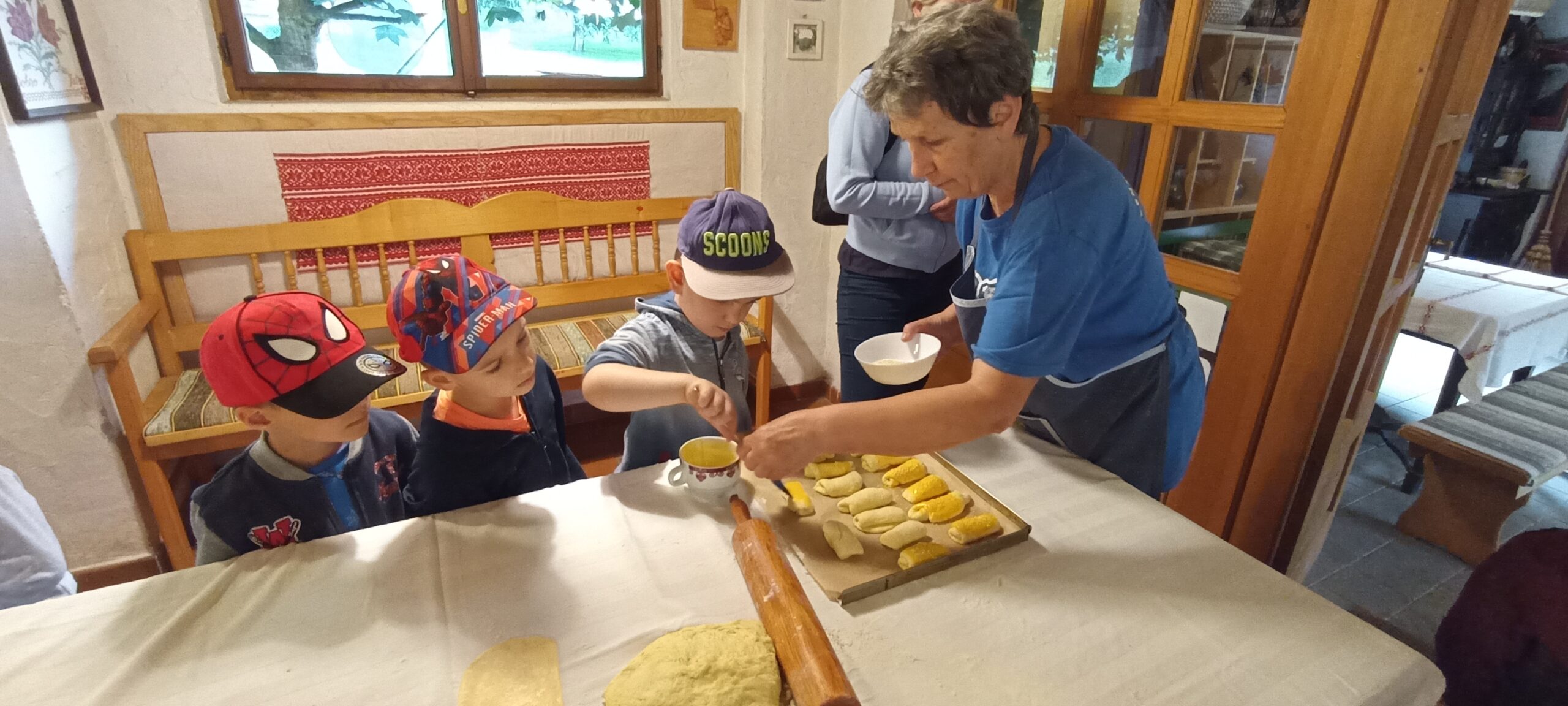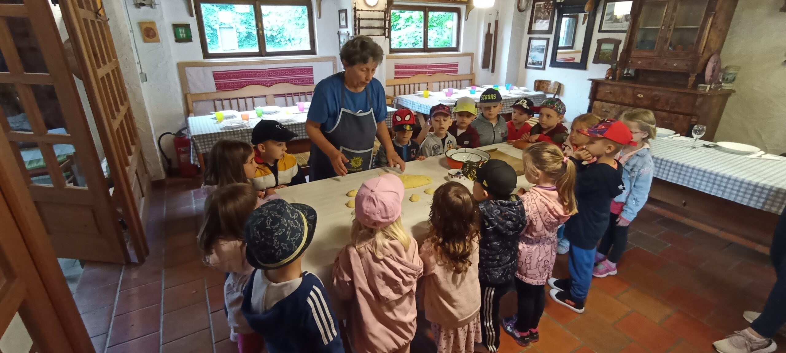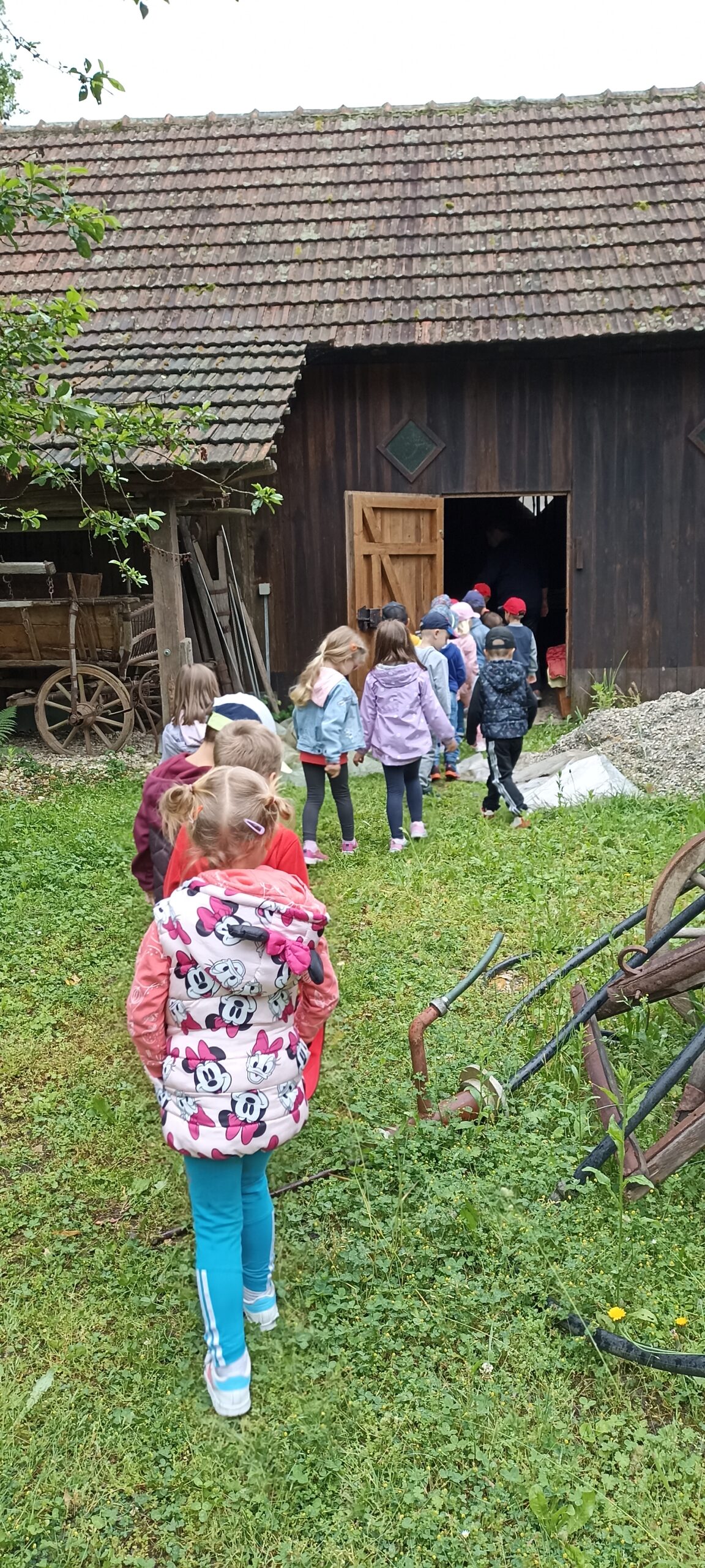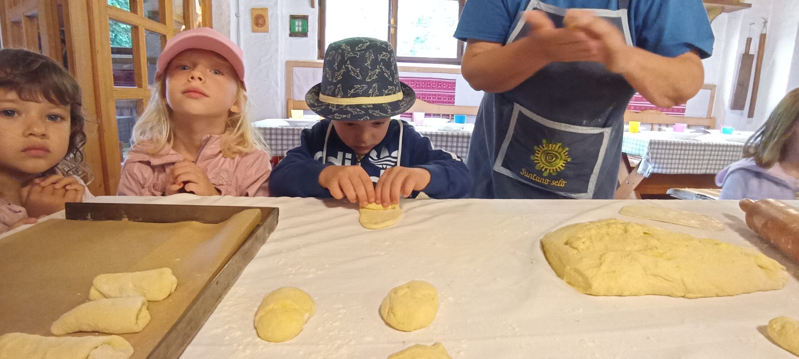 Kada smo stigli u Sunčano selo nije bilo previše sunčano, no to nas nije dalo smesti u našem naumu da naučimo peći kruh. Gospodin Davor i gospođa Helena veoma su nas ljubazno dočekali i uputili na igralište kako bi se malo rastegnuli i pripremili za radionicu. Nakon brzinske igre Dan- noć uputili smo se u štagalj gdje nam je gospodin Davor pokazao razne sjemenke od kojih možemo raditi kruh i kolače. Pokazao nam je razne alate za obradu zemlje, te objasnio kako treba pripremiti zemlju prije sjetve. No, Mateo M. je već prepoznao neke od tih alata, te nam je ispričao kako on to doma s tatom radi. Nakon toga pogledali smo kako se dobiva brašno, te smo i mi isprobali zavrtjeti mlin. Od okretanja mlina smo već poprilično ogladnjeli, tako da smo se zaputili zamijesiti kiflice s gospođom Helenom. Naučila nas je kako ih namotati, čime ih mažemo da budu sjajnija i ljepša, te što dodati kako bi okus bio još bolji. Pričekali smo da se naše kiflice ispeku, te smo se ugrijali i okrijepili finim domaćim ručkom.
