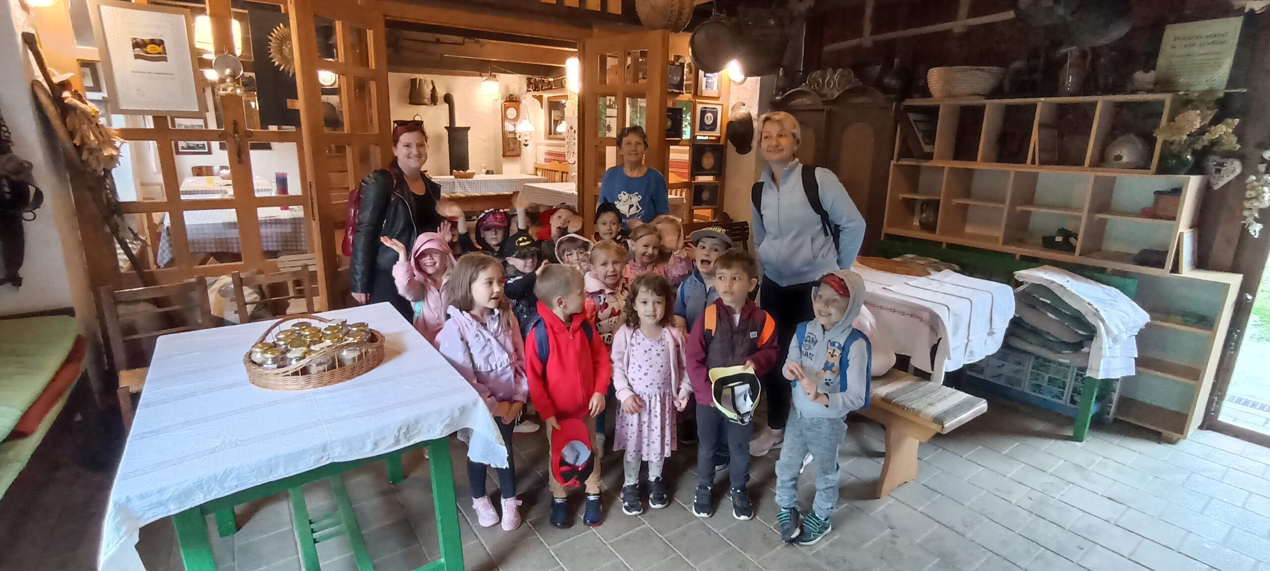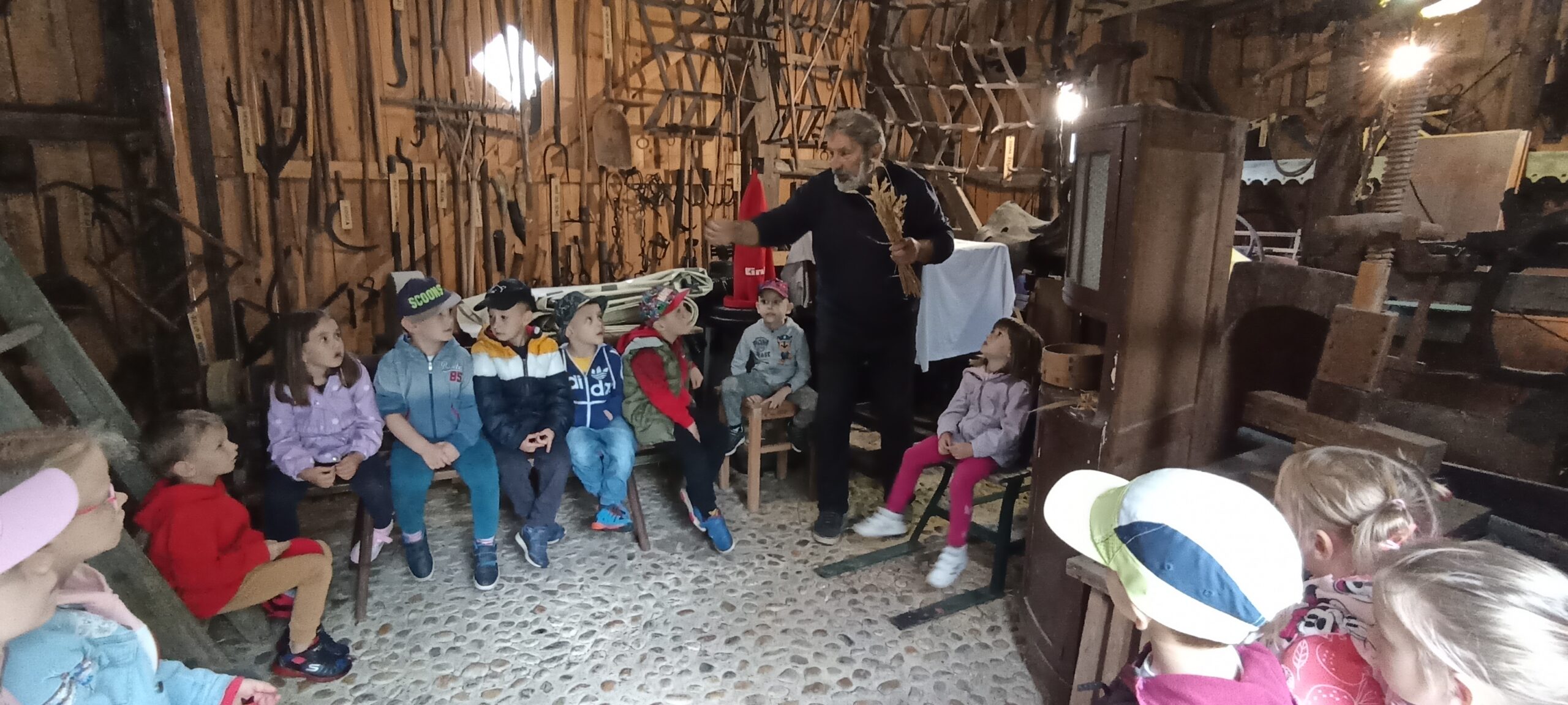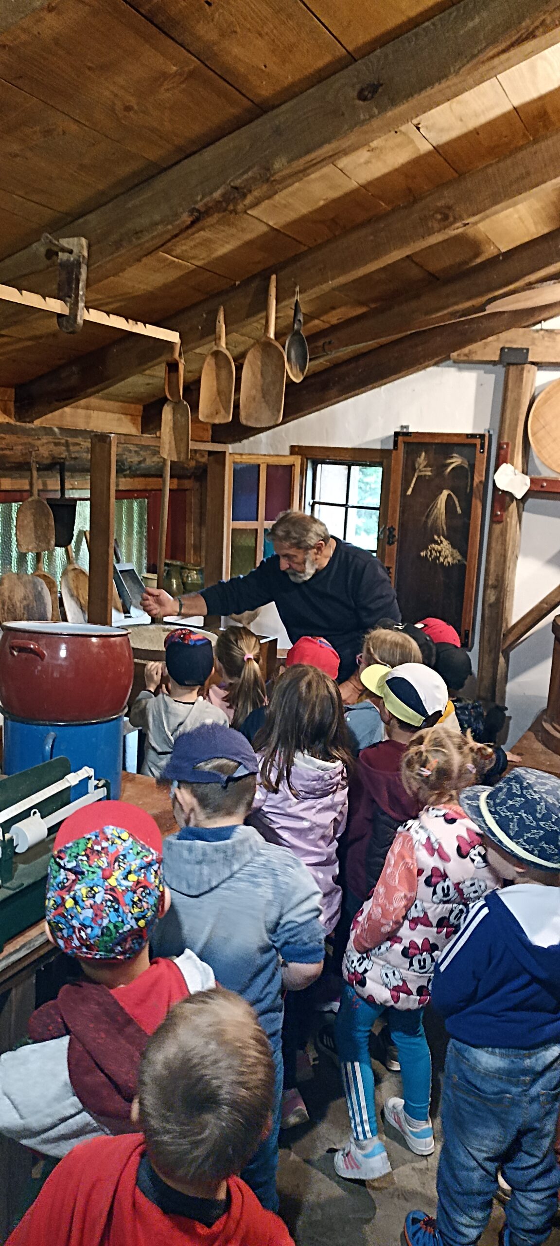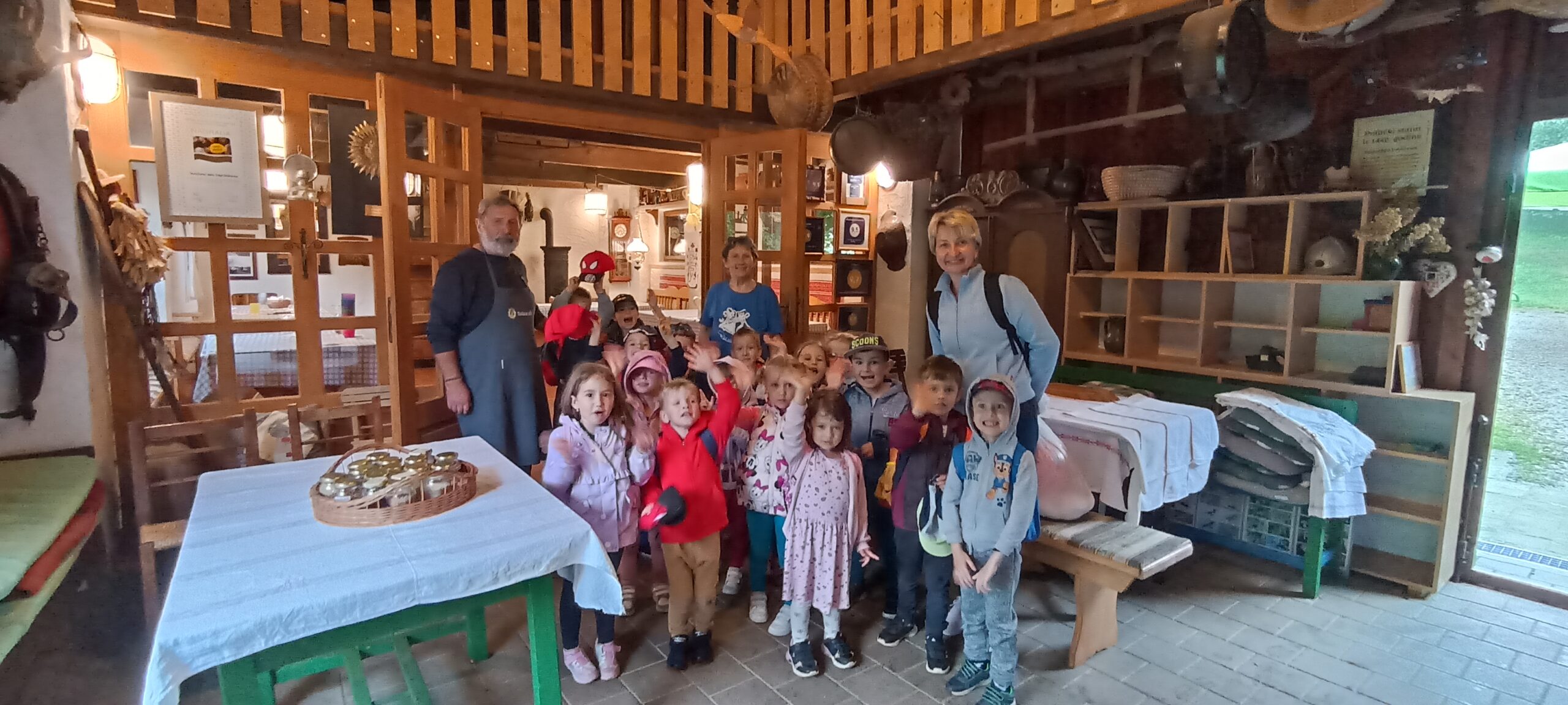 Kada smo stigli u Sunčano selo nije bilo previše sunčano, no to nas nije dalo smesti u našem naumu da naučimo peći kruh. Gospodin Davor i gospođa Helena veoma su nas ljubazno dočekali i uputili na igralište kako bi se malo rastegnuli i pripremili za radionicu. Nakon brzinske igre Dan- noć uputili smo se u štagalj gdje nam je gospodin Davor pokazao razne sjemenke od kojih možemo raditi kruh i kolače. Pokazao nam je razne alate za obradu zemlje, te objasnio kako treba pripremiti zemlju prije sjetve. No, Mateo M. je već prepoznao neke od tih alata, te nam je ispričao kako on to doma s tatom radi. Nakon toga pogledali smo kako se dobiva brašno, te smo i mi isprobali zavrtjeti mlin. Od okretanja mlina smo već poprilično ogladnjeli, tako da smo se zaputili zamijesiti kiflice s gospođom Helenom. Naučila nas je kako ih namotati, čime ih mažemo da budu sjajnija i ljepša, te što dodati kako bi okus bio još bolji. Pričekali smo da se naše kiflice ispeku, te smo se ugrijali i okrijepili finim domaćim ručkom.