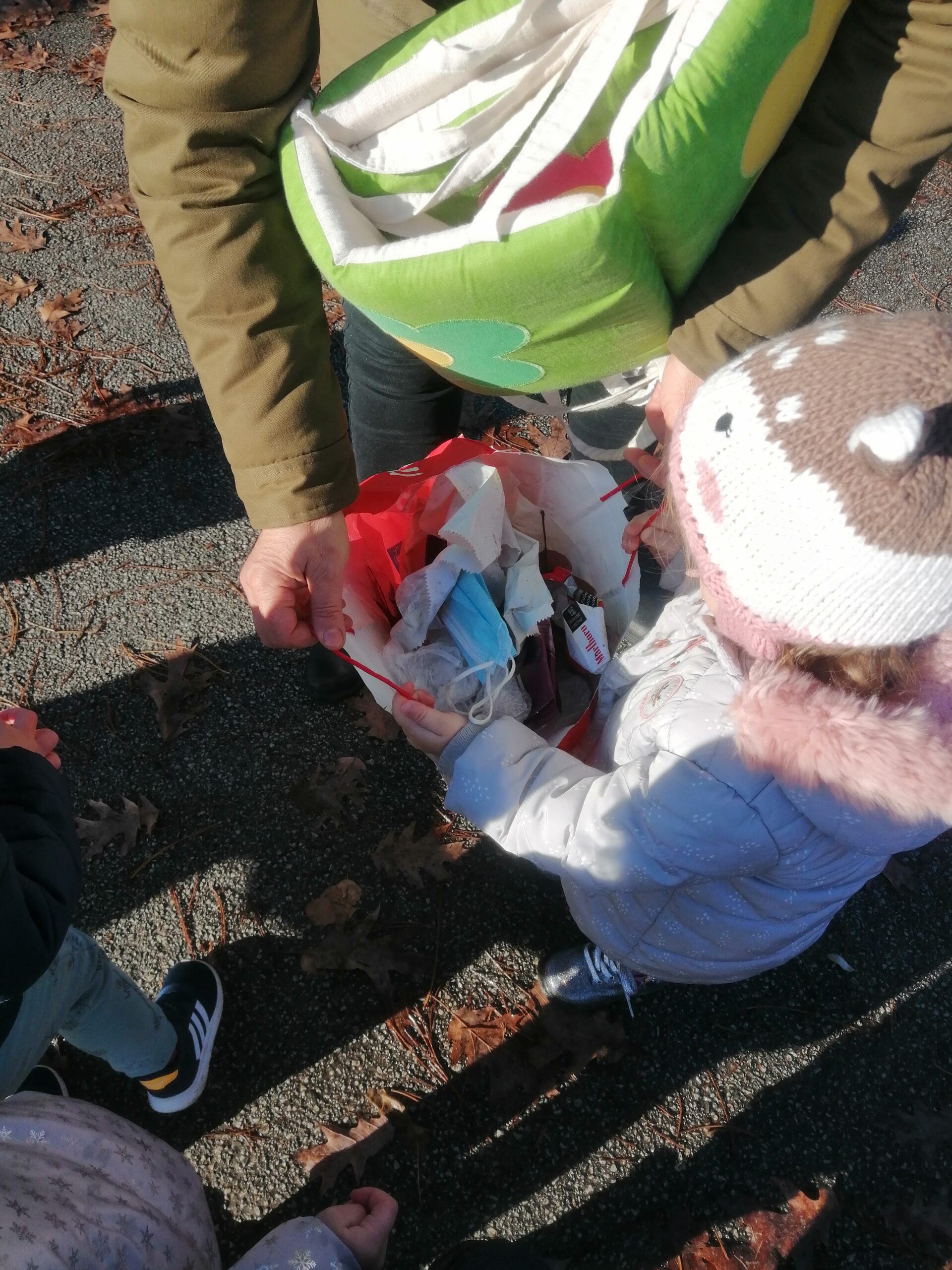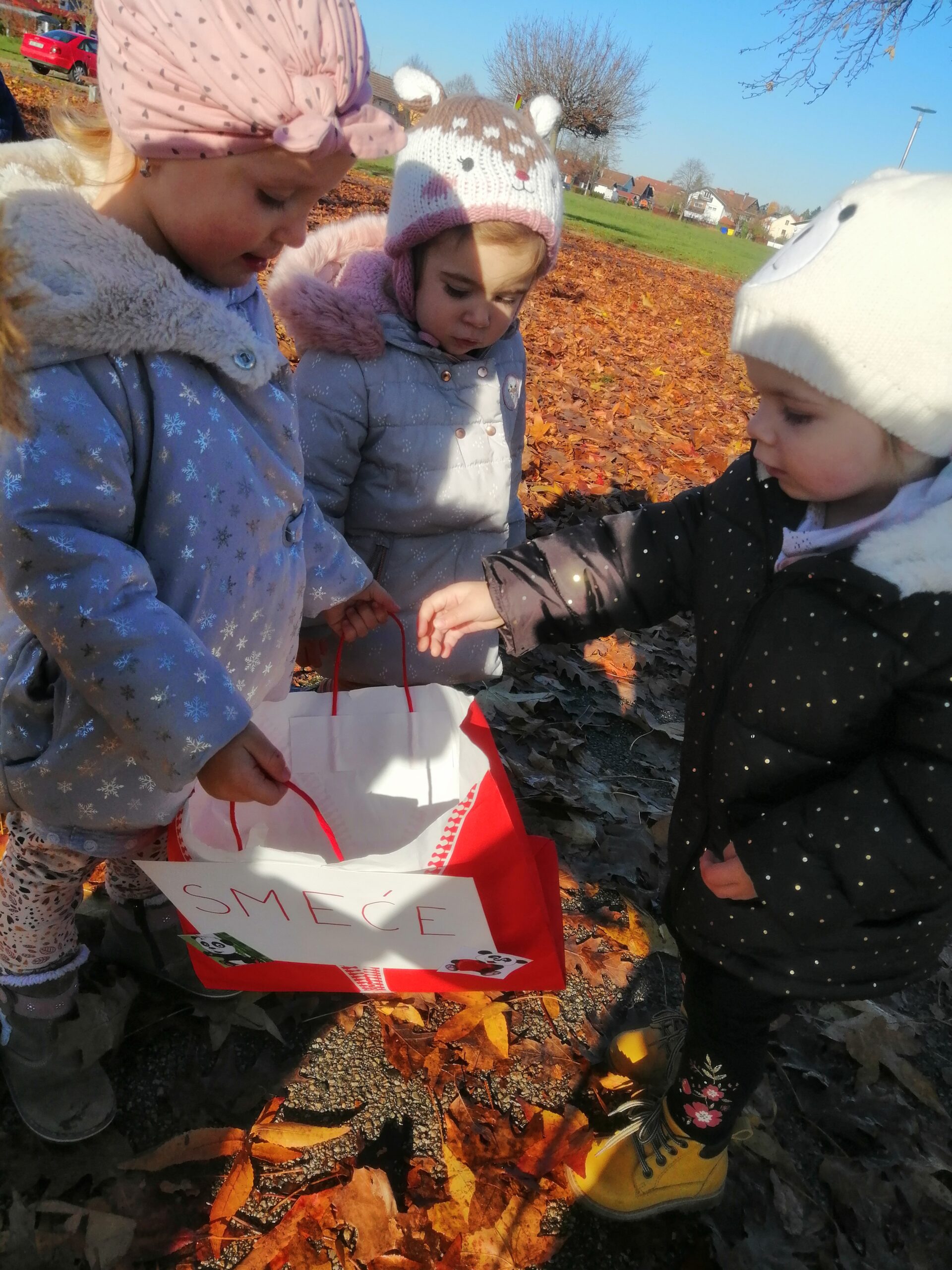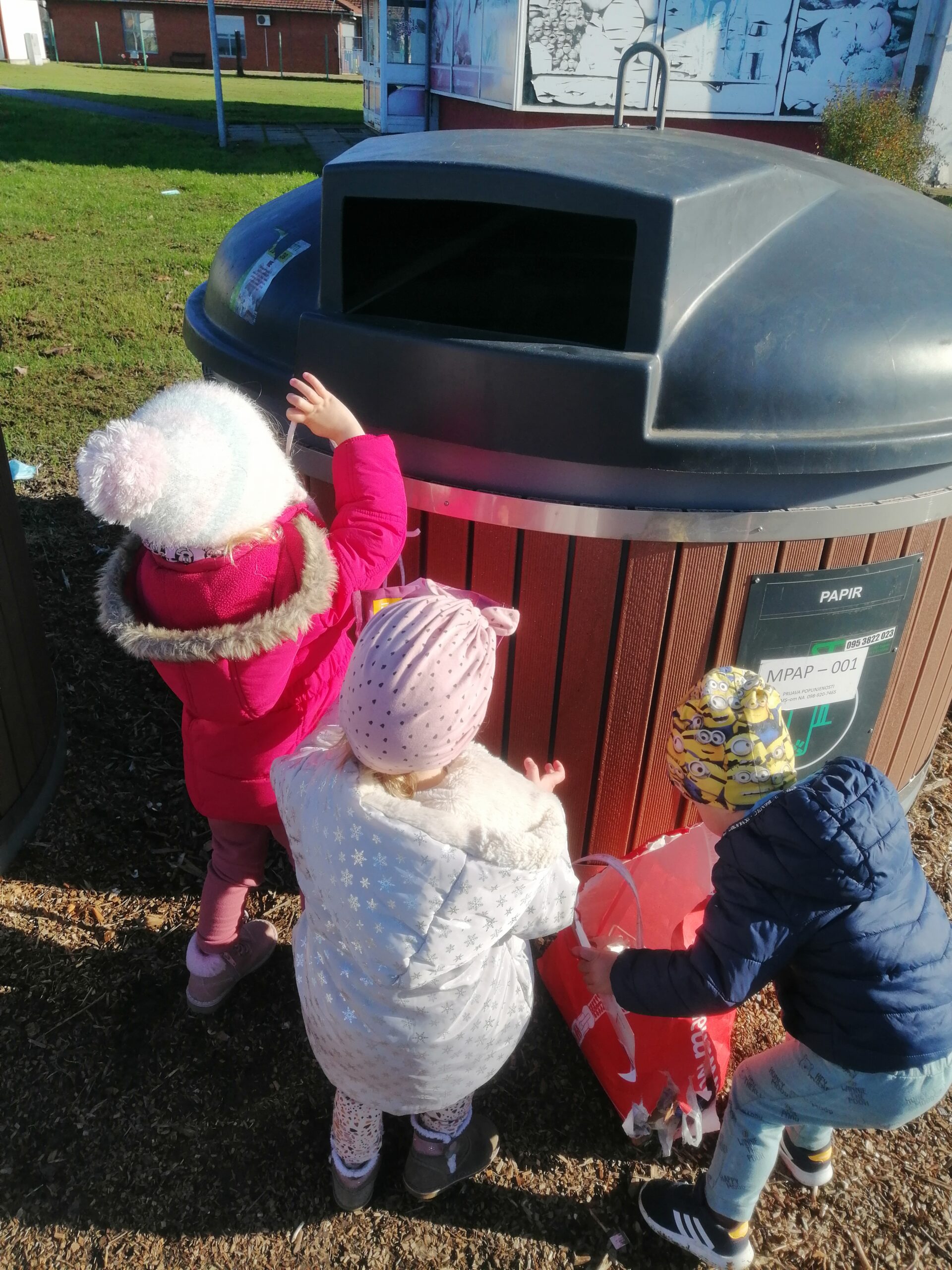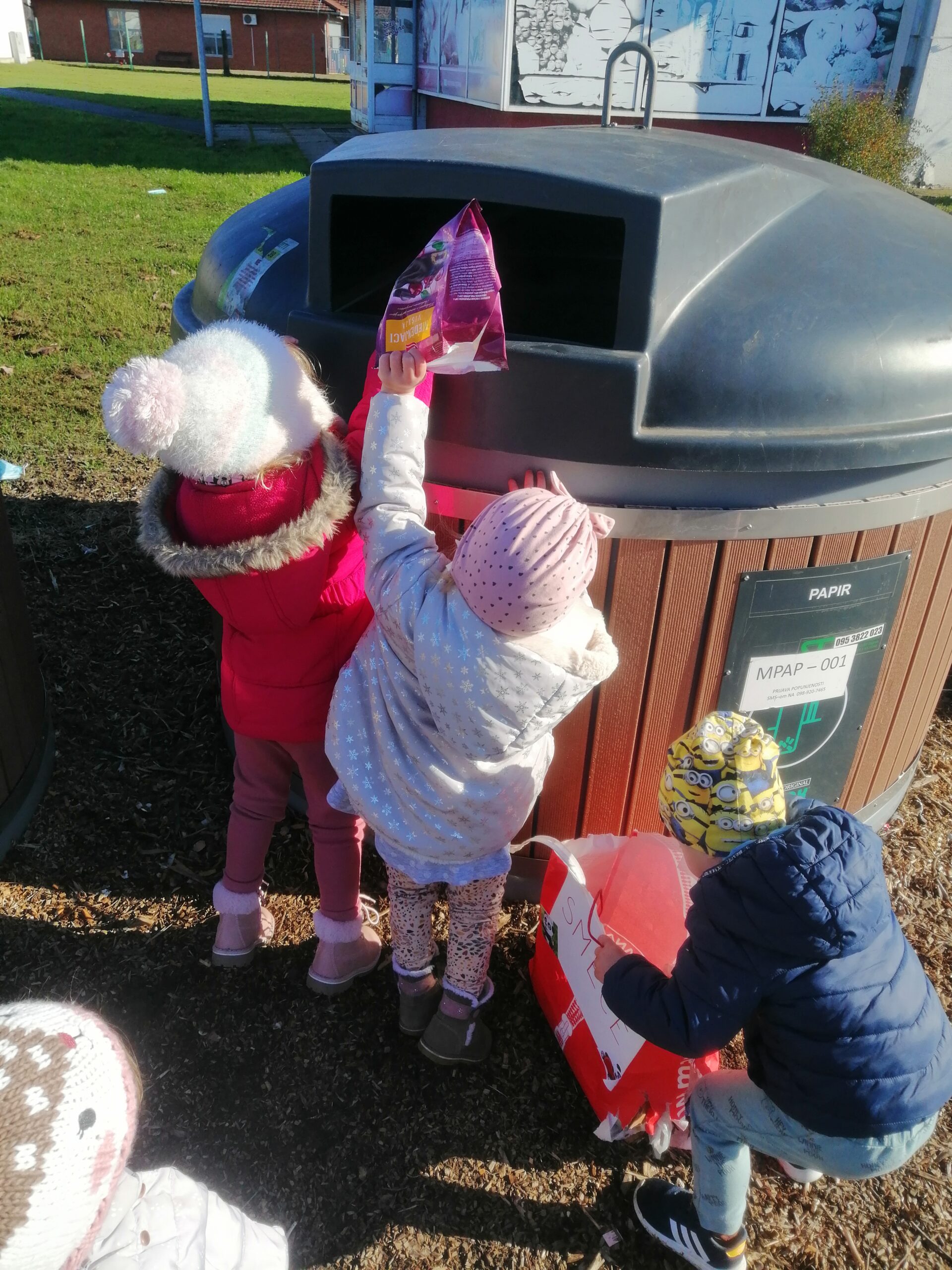 Kako bismo od malih nogu ekološki osvijestili djecu o važnosti čistog okoliša i načinima brige za njegovo očuvanje, Pandice su provele eko aktivnost sakupljanja otpada tijekom šetnje okolicom vrtića. Djeca su vrlo ozbiljno i zainteresirano pristupila ovoj aktivnosti te su aktivno sudjelovala u sakupljanju otpada. Kada smo napunili našu eko vrećicu, otpad smo odnijeli do kontejnera za otpad te ga tamo odložili. Djeca su također stjecala pozitivne navike, usvajala znanja i vještine bitne za ostvarivanje zdravog načina života te brigu o sebi i okolišu.