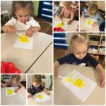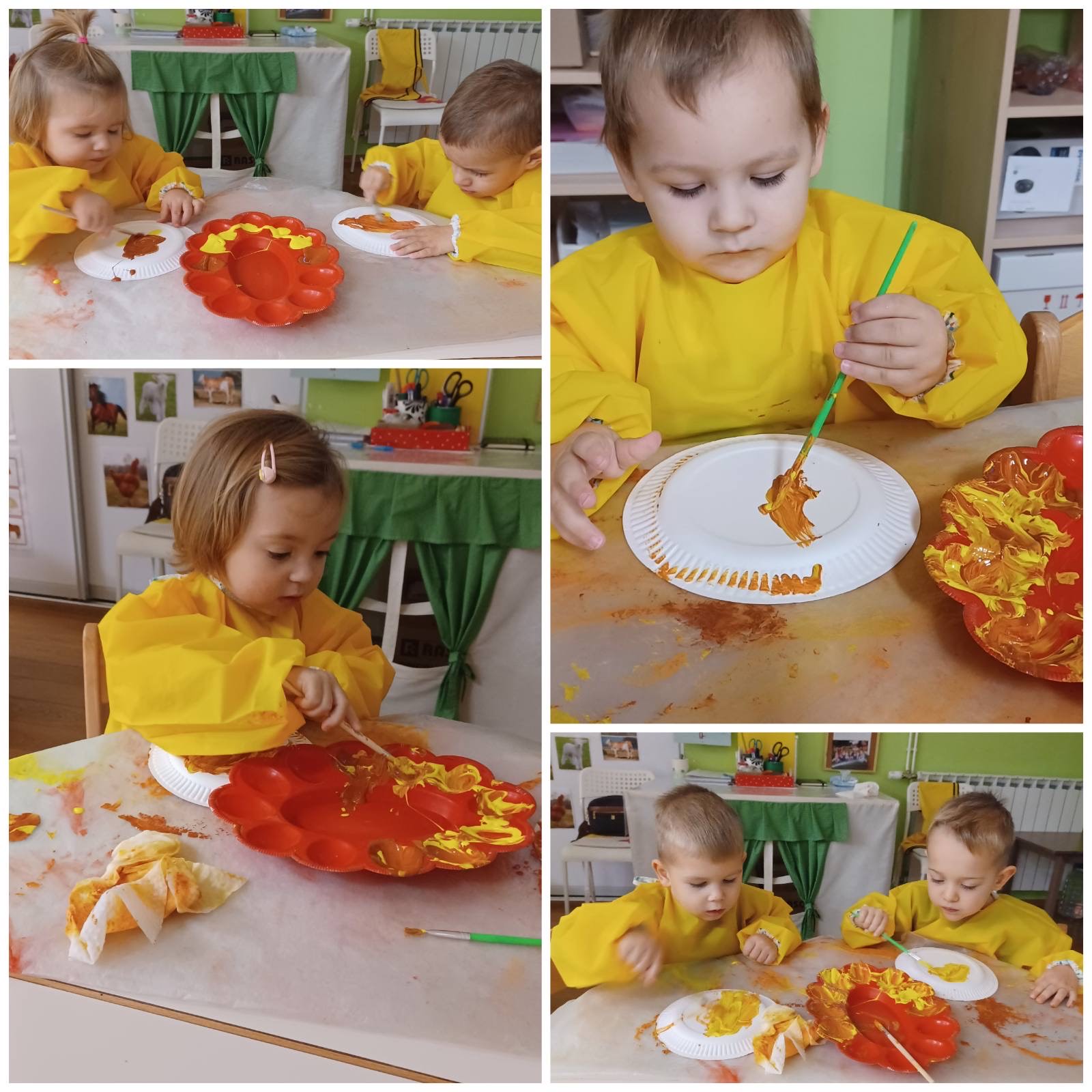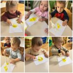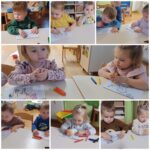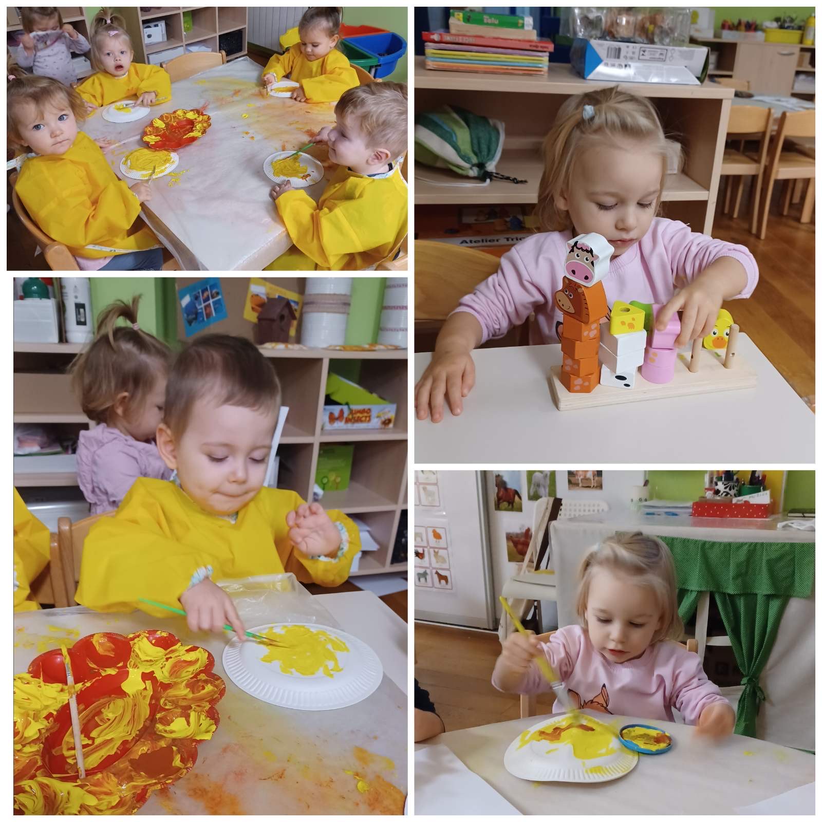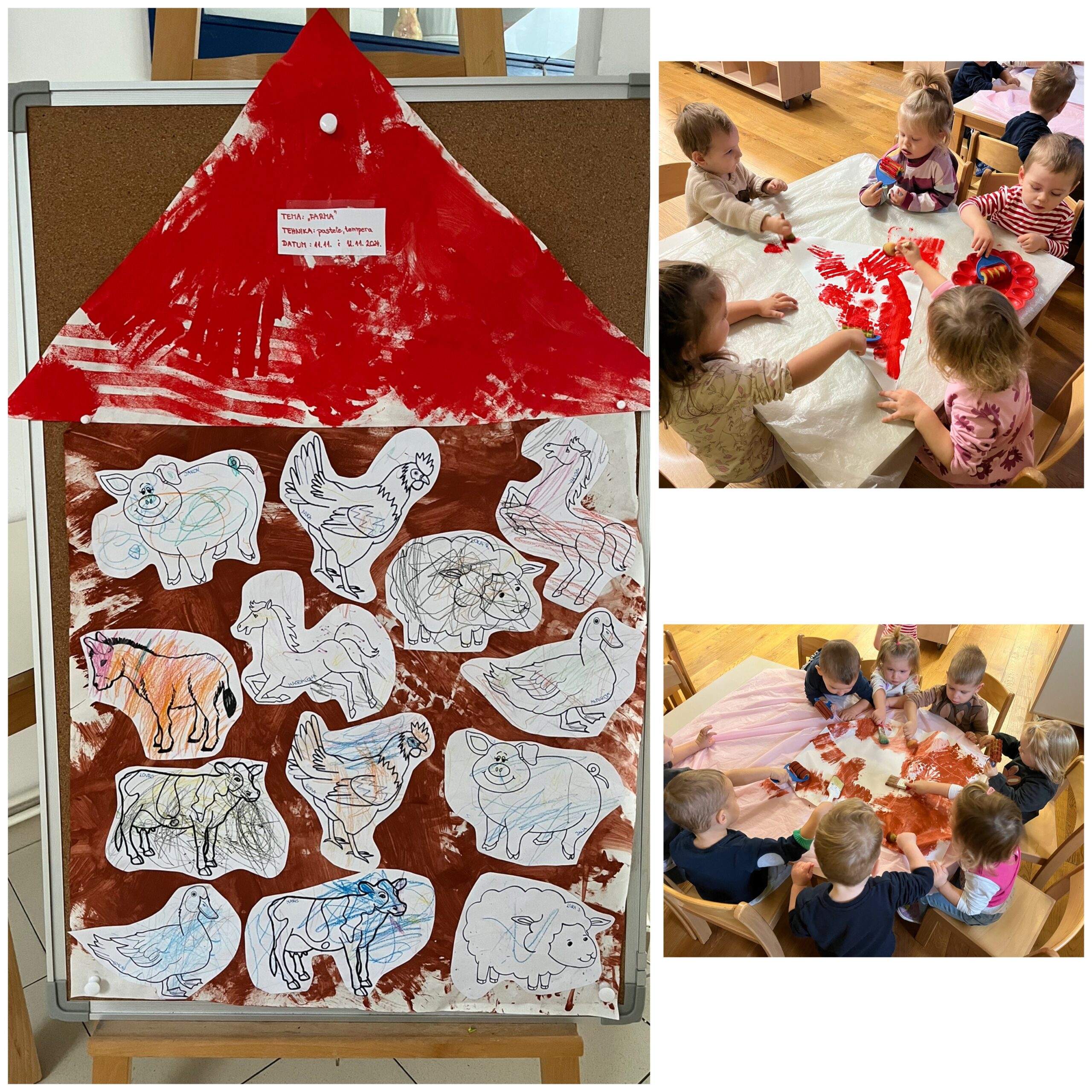 Kroz vrijedne ruke „Pužića“ je tijekom proteeklih tjedana proizašlo mnogo šarenih radova koji su krasili naš hodnik. Prljavi praščić je nastao tehnikom otiskivanja tempere spužvicom, dok je kravica nastala otiskivanjem dječjih dlanova. Zlatna koka je nastala izbojavanjem kistom, a pilić je nastao šaranjem plastičnom vilicom. Šablone domaćih životinja djeca su najprije obojila pastelama, a zatim smo ih trebali smjestiti u farmu koju su djeca obojila temperama raznim spužvicama i valjcima.