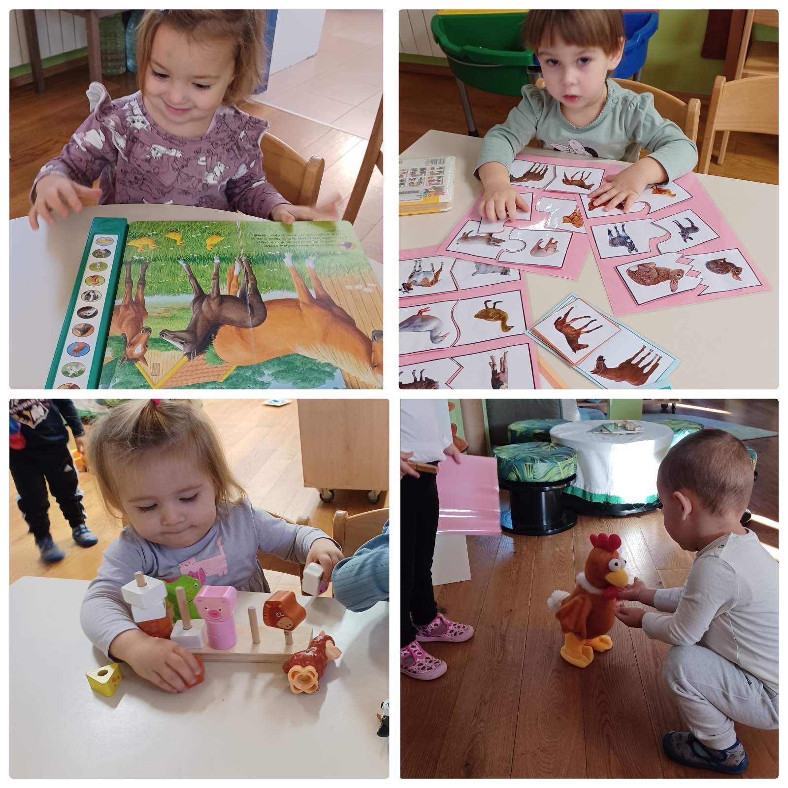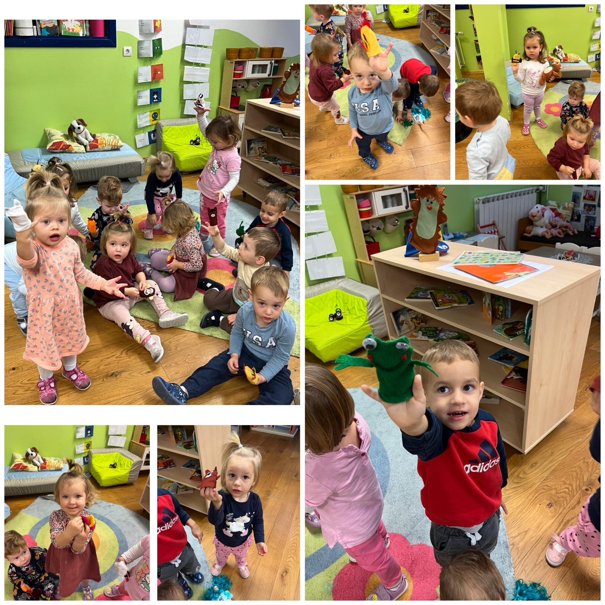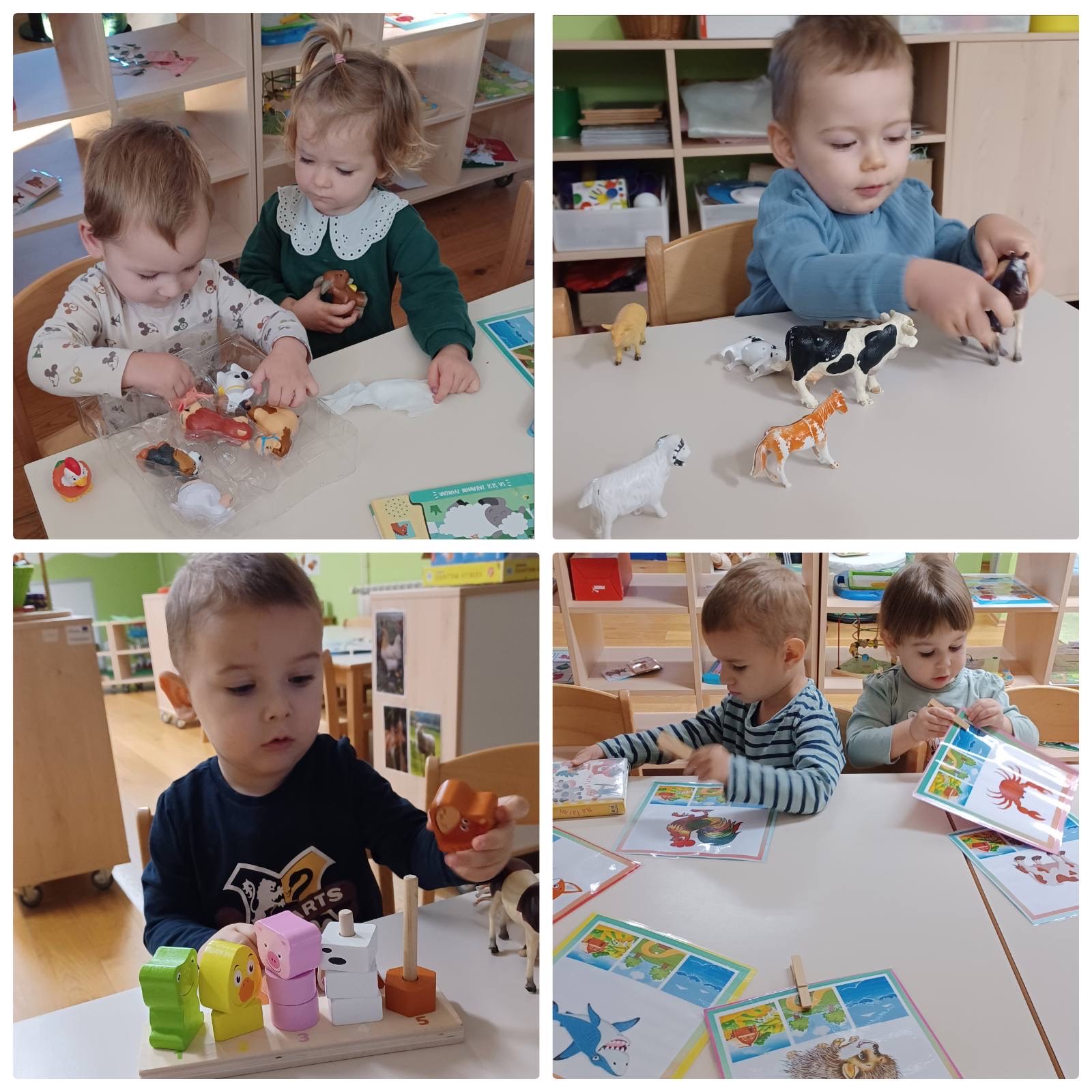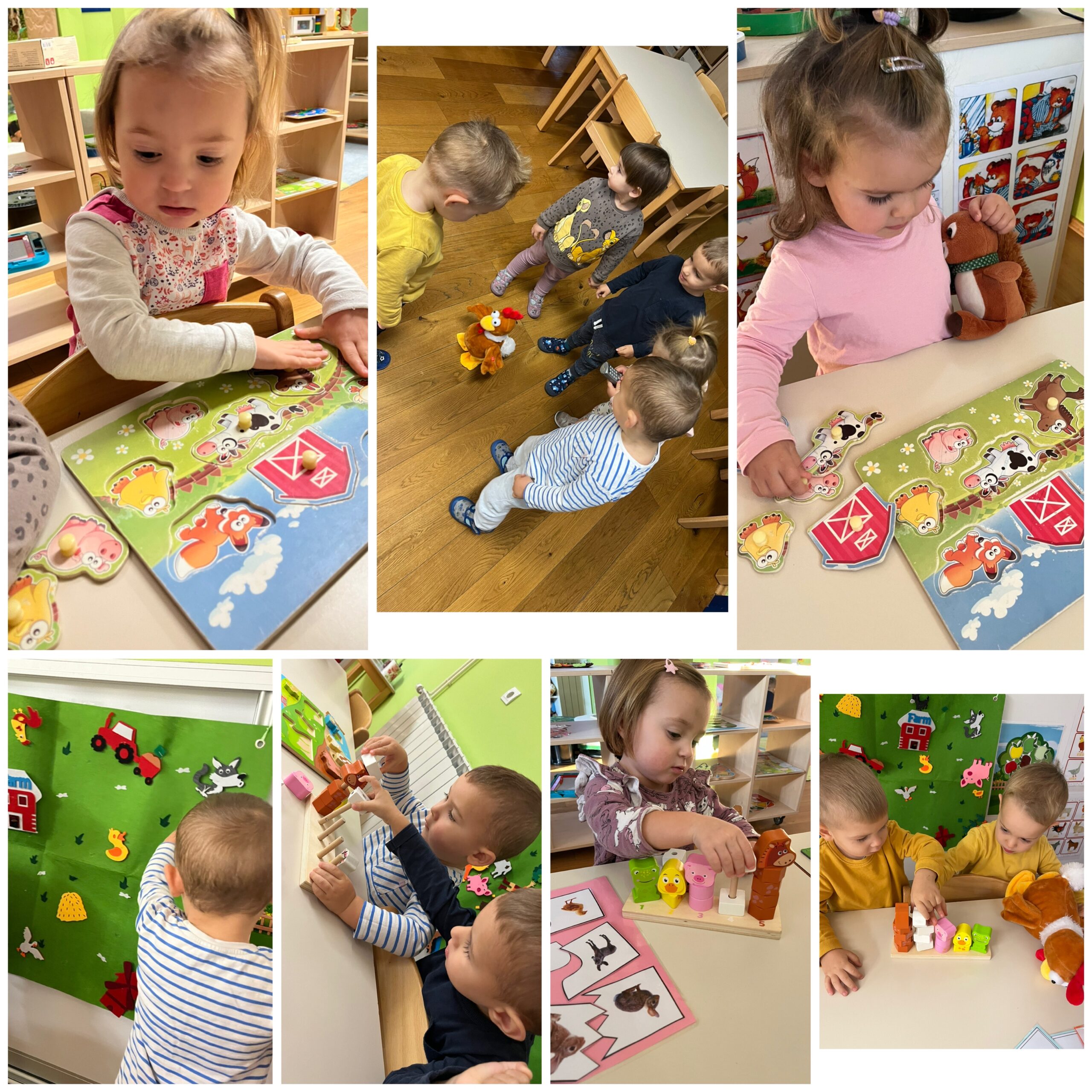 Tijekom studenog „Pužići“ su stjecali nove spozanje i znanja o domaćim životinjama. Raznim stolno- manipulativnim nastojale smo kod djece poticati spoznaju o tome koje su uopće domaće životinje te gdje žive. Tu su bile razne umetaljke, nizalice te dvodijelne spajalice sa motivima domaćih životinja i njihovih mladunaca. Djeci su se jako svidjele igre oponašanja kretanja i imitiranja glasanja životinja gdje su se svi veselo kretali zajedno sa odgojiteljicama. Odmotavanjem konca sa plastičnih figurica domaćih životinja djeca su stjecala koncentraciju i fokusiranost na radnju, a igrama punjenja i pražnjenja vještinu preciznosti. „Pužići“ su posebnu pažnju pridavali zvučnim slikovnicama koje su rado samostalno listali kao i zvučne igračke te plastične figurice domaćih životinja. Štapne lutkice su i ovaj put bile neizostavne, djeca su radosno manipulirala s njima kao i s lutkicama za prste koje su njihovne majke vješto izradile na radionici te im se ovim putem zahvaljujemo na suradnji.