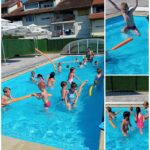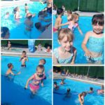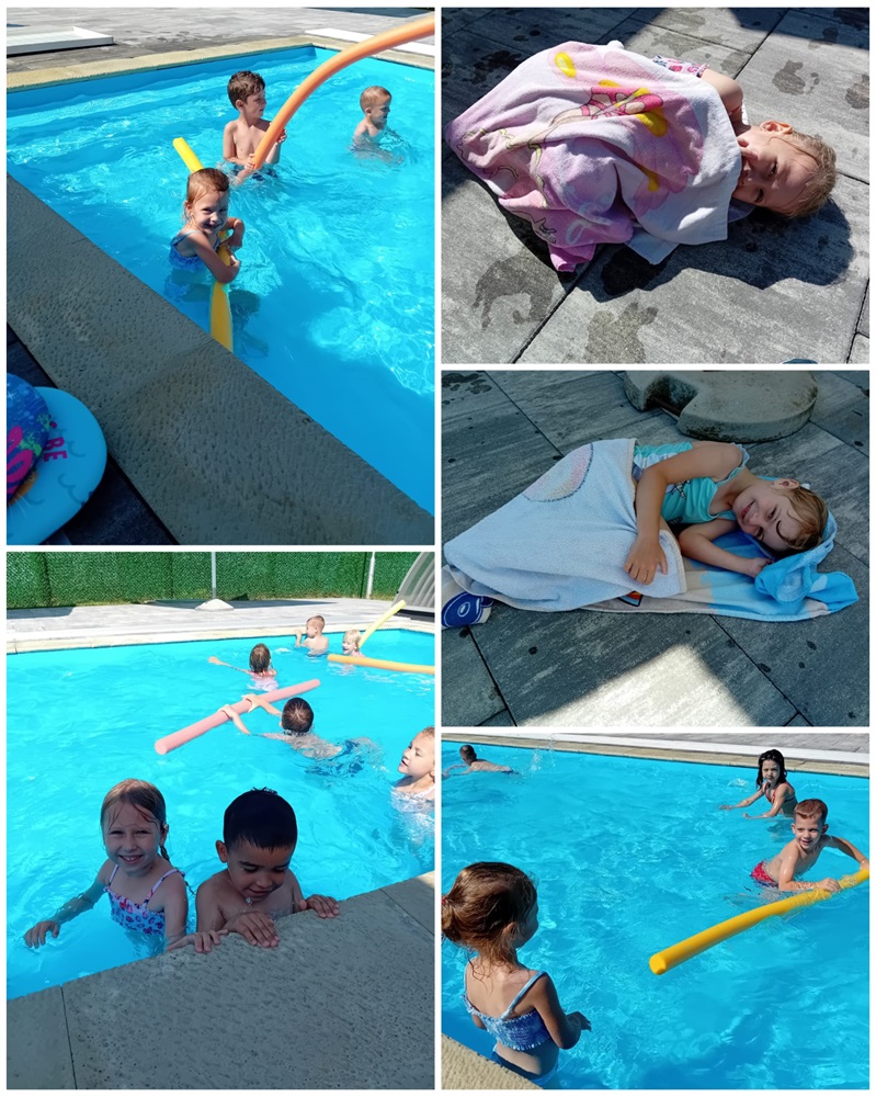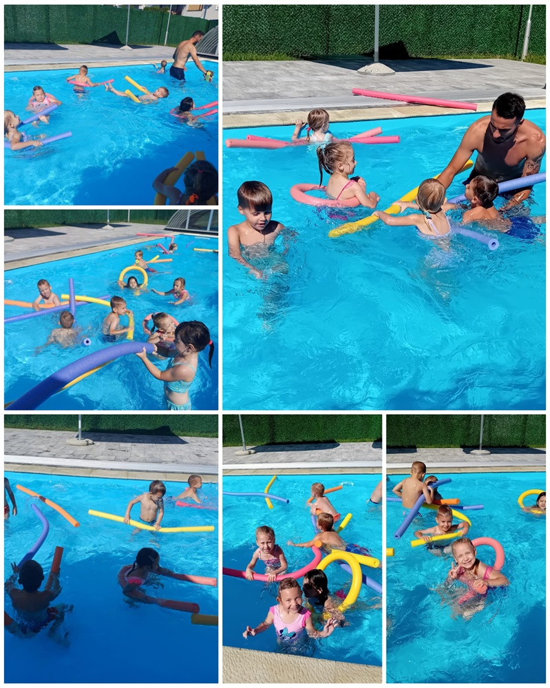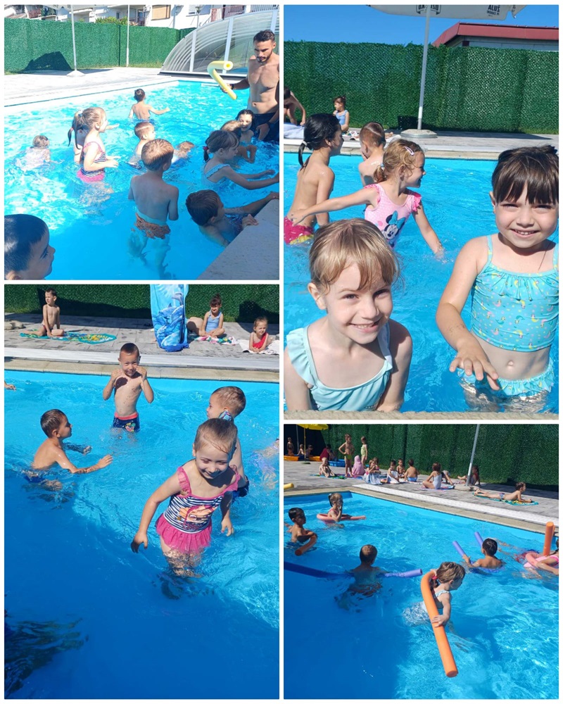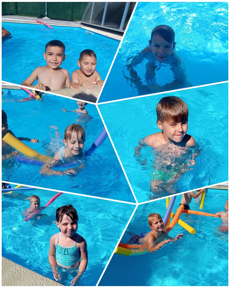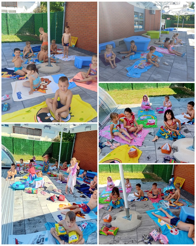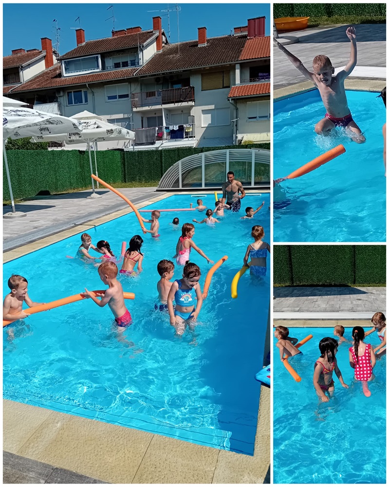 Baš iz ovih razloga djeca iz skupina Točkice i Žirafice vruće ljetne dane provode na našem vrtićkom bazenu. Djeca u bazenu borave uz kineziologa Ivana koji ih uči održavati se na vodi, roniti, raditi vodene balončiće te „plivati“. Prvi dan djeca su pokazala kako ih nije strah vode i kupanja na bazenu. Tako su prvo, a i svako sljedeće kupanje u bazenu bili bez plivalica i luftića. Jedino pomagalo koje djeca koriste su „crvići“. Kad se djeca opuste ni oni nisu potrebni.