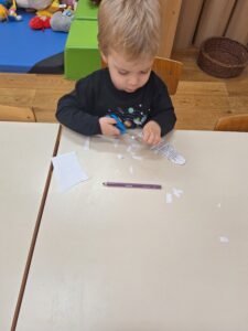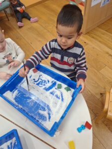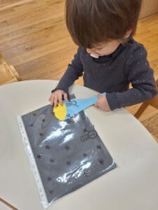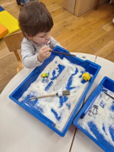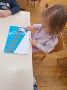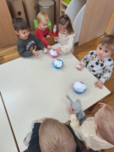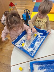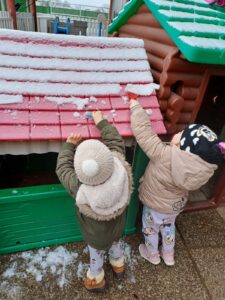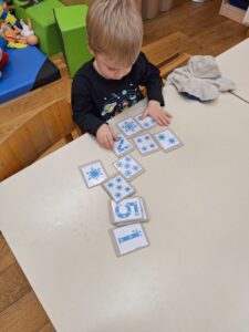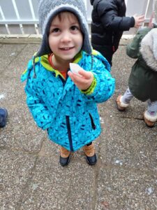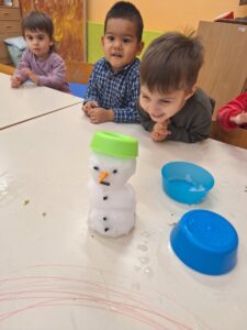 Za spoznavanje vanjskog svijeta koristili su senzorne boce koje su imitirale padanje snijega i senzorne kutije u kojima je kokosovo brašno zamijenilo pravi snijeg. Od prvih pravih snježnih pahulja napravili smo malog snjegovića. Spoznaju o zimi proširili su igrajući se raznim didaktičkim igrama koje smo im napravile na temu zime.