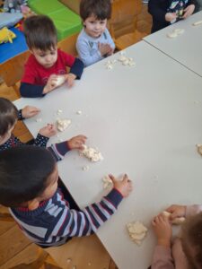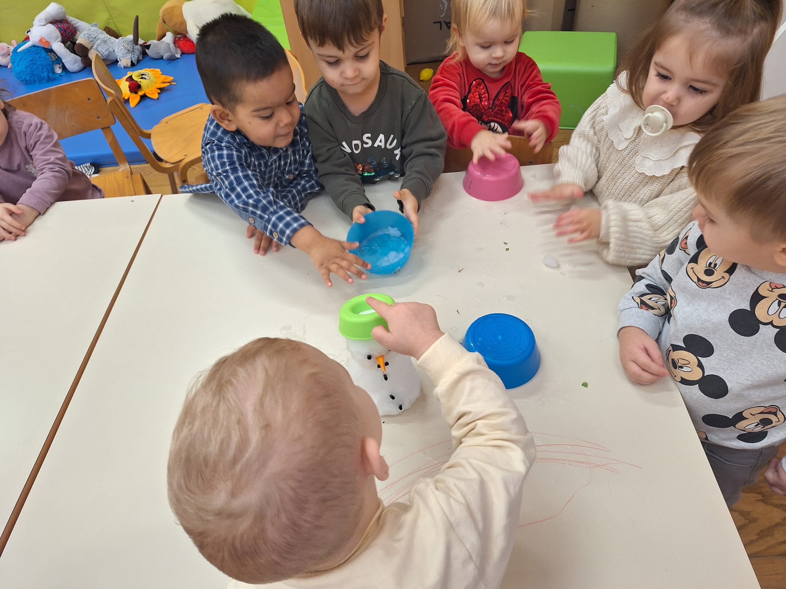 Svoje oduševljenje snijegom, pahuljicama i zimskim aktivnostima pokazali su boravkom na otvorenome, a kasnije su prekrasnim likovnim radovima ukrasili vrtićke panoe. Slikali su pahulje snijega prstima, bojali temperama kape i lijepili dijelove snjegovića od kolaža. Od slanog tijesta oblikovali su kuglice i pokušali napraviti snjegovića.